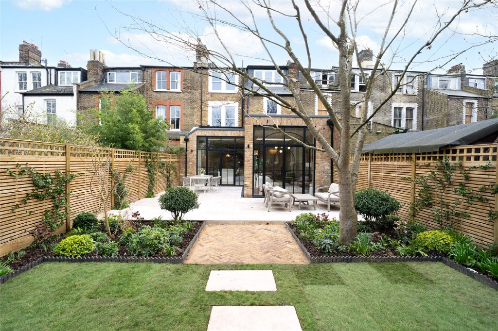 Originally arranged over three storeys, this substantial Victorian house has been comprehensively rebuilt and renovated from the ground up to create a carefully considered four-bedroom, three-bathroom family home extending to approximately 2,600 sq ft, together with a substantial detached garden studio. Positioned within easy reach of Queens Park, the house combines retained period character with a confident architectural approach and an exceptional standard of craftsmanship throughout. The original façade has been carefully preserved, with traditional sash windows and decorative brickwork complemented by a cobblestone granite forecourt. Inside, the house retains its period proportions while introducing refined contemporary detailing including deep moulded cornicing, panelled walls and bespoke joinery.