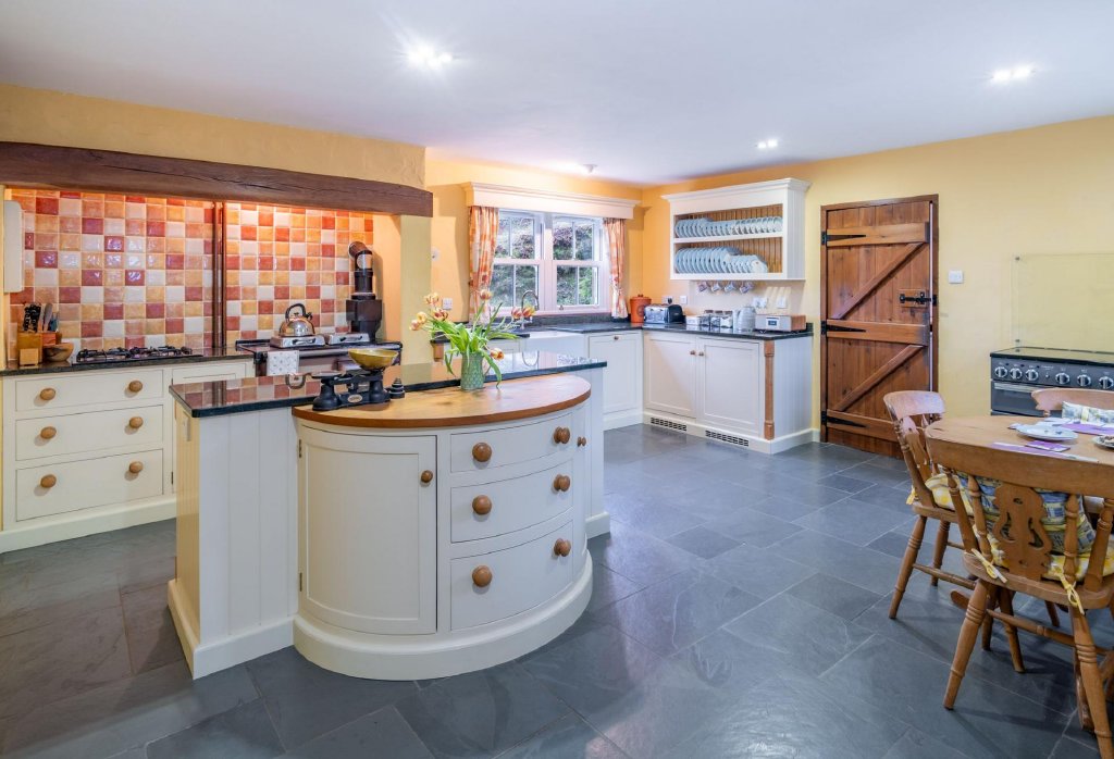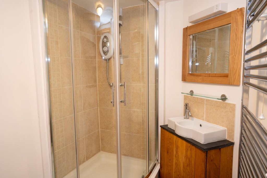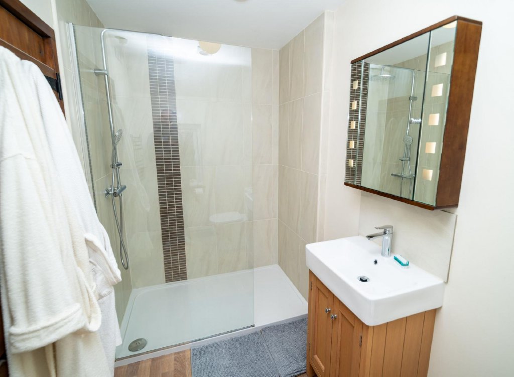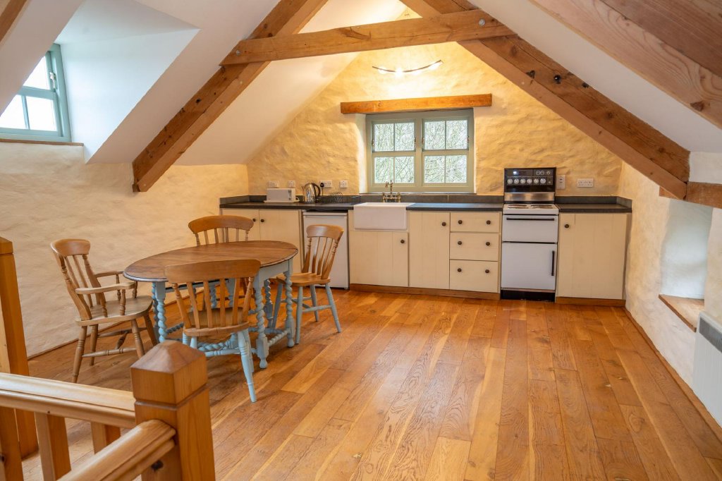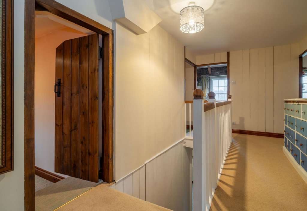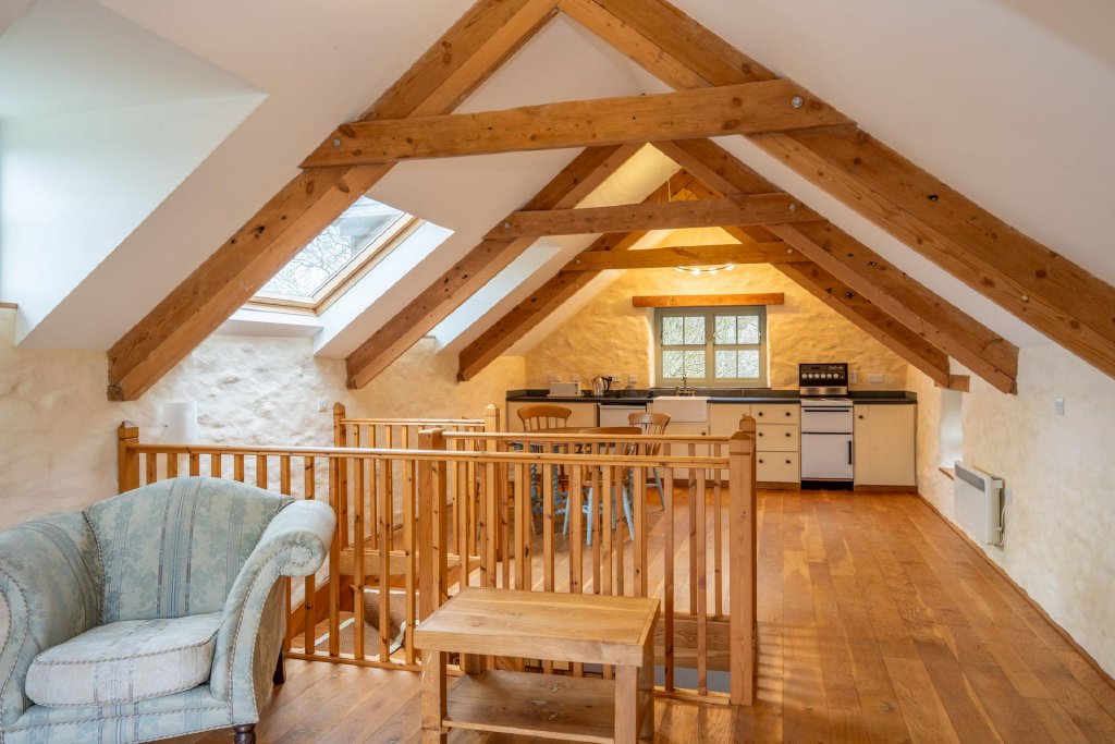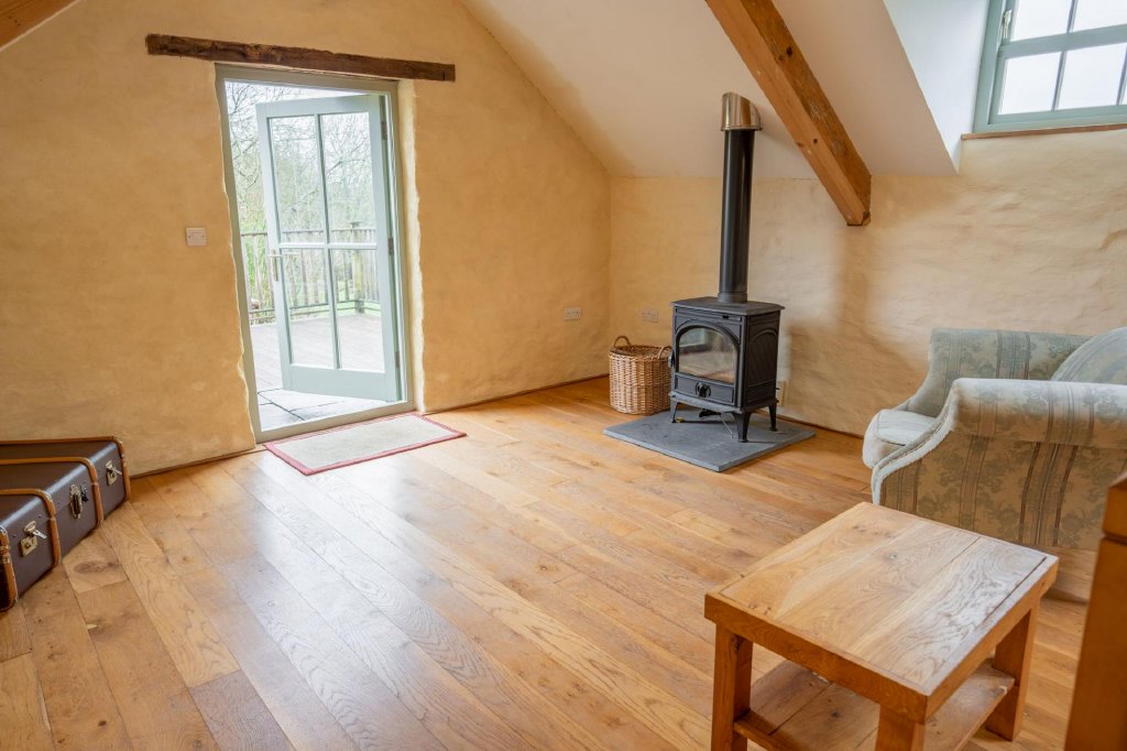 To the ground floor are two generous double bedrooms together with a well-appointed shower room. The first floor opens into a particularly spacious open-plan living area, filled with natural light and enjoying elevated countryside views — creating a wonderful entertaining or relaxation space.