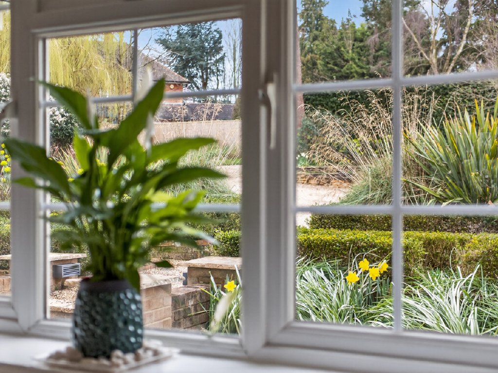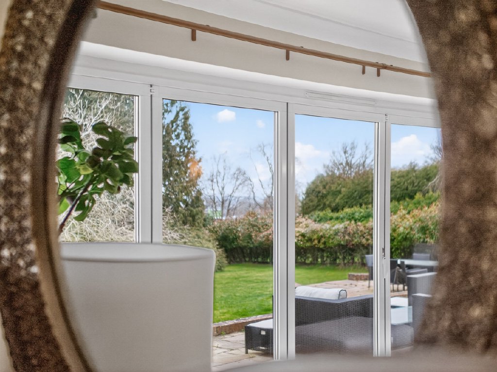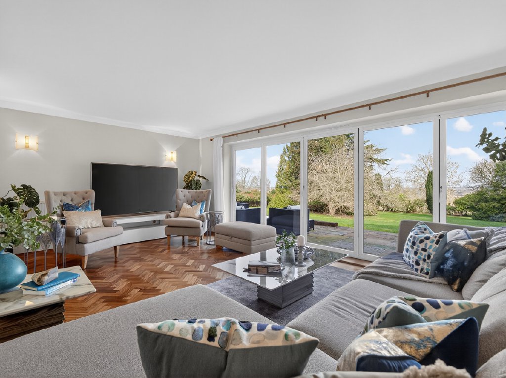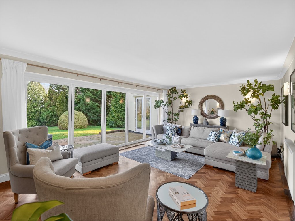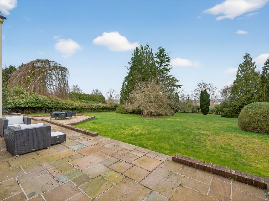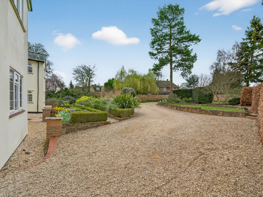 The gardens feel established and secluded, framed by mature planting that enhances privacy. A large terrace provides an ideal setting for outdoor dining and entertaining, while the wide driveway offers ample off-road parking alongside the double garage. In all the plot extends to approximately 0.83 acres.