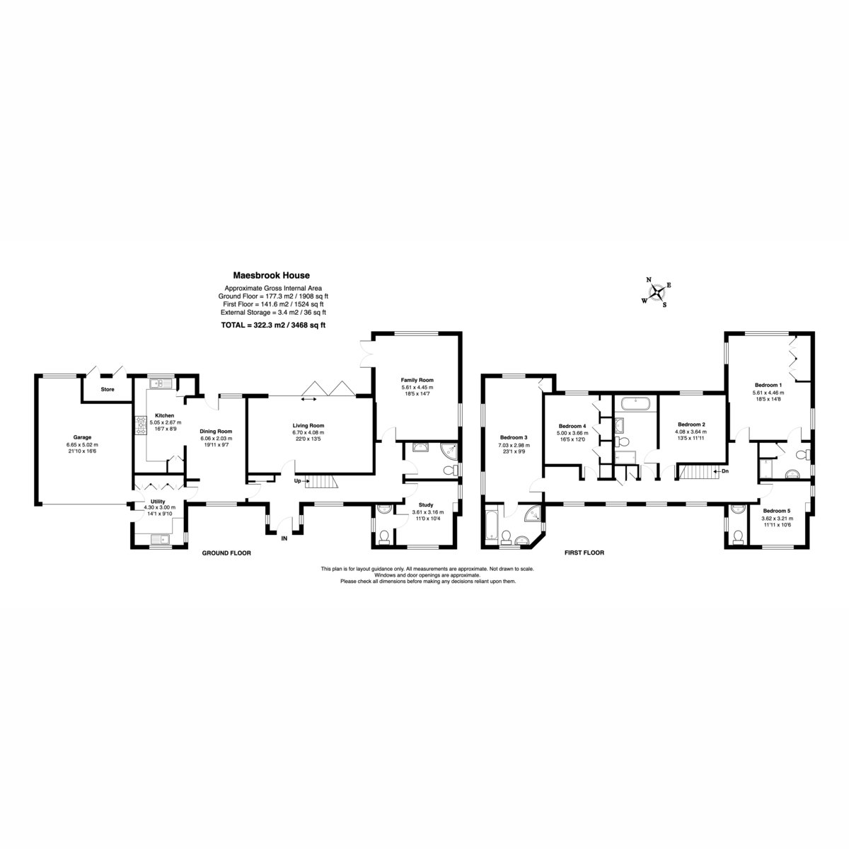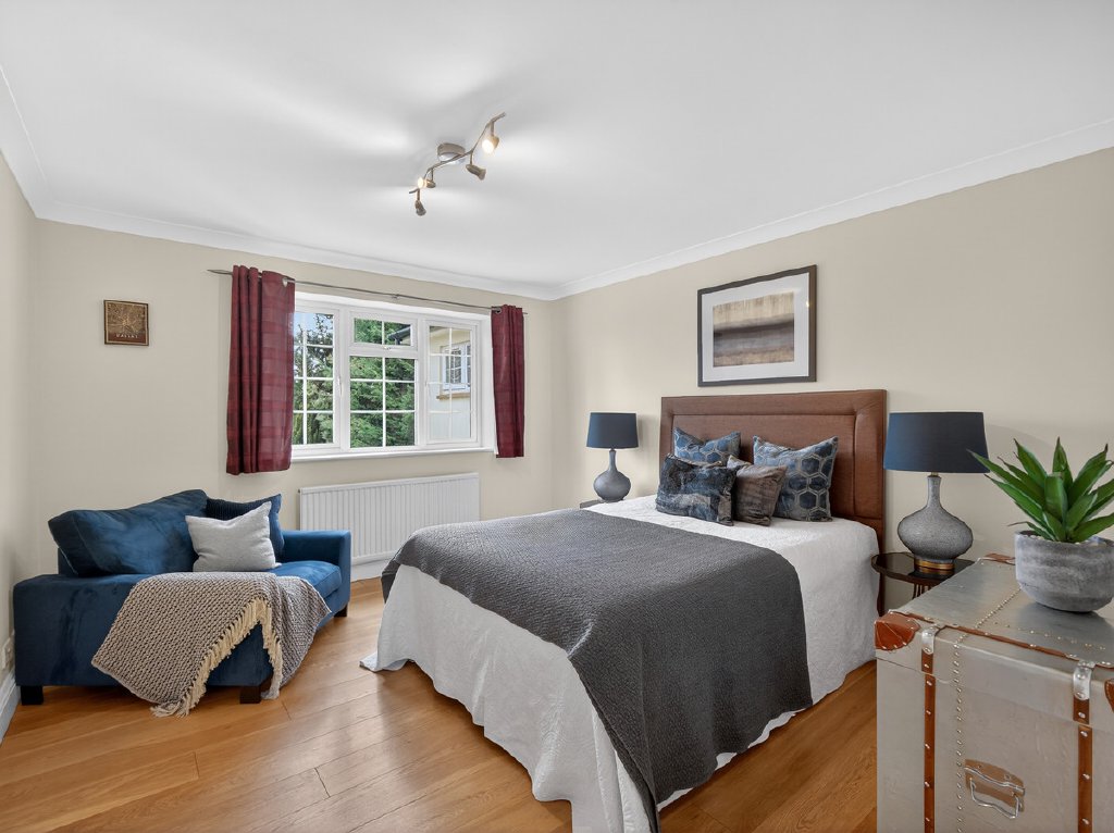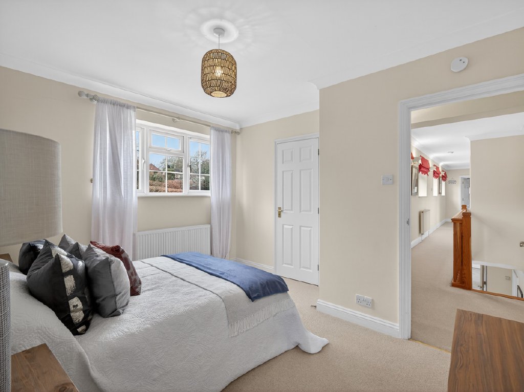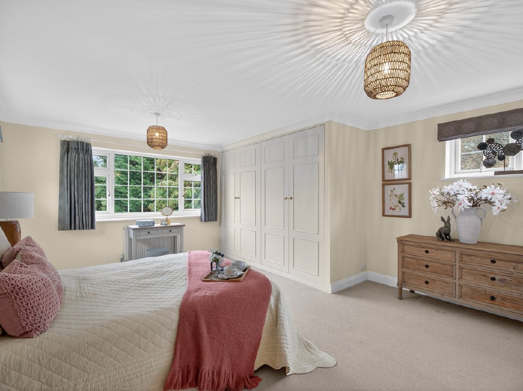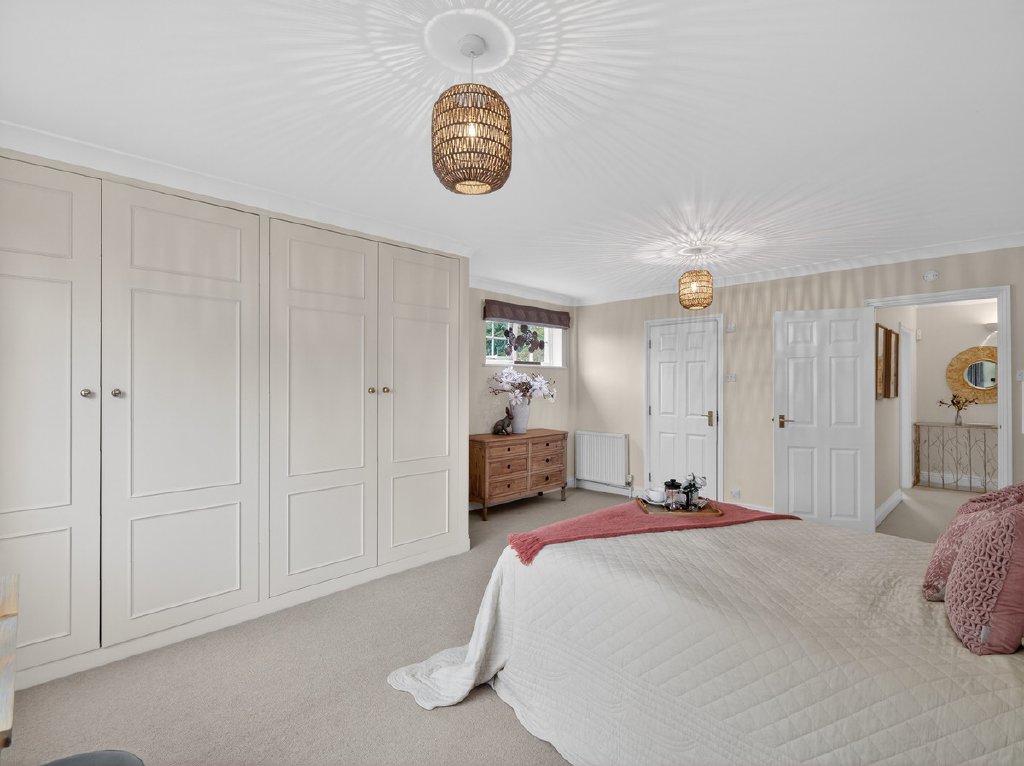 Upstairs, the first floor provides five well-proportioned double bedrooms, designed to suit family life. The principal bedroom is a calm and generous space with built-in wardrobes and a well-appointed ensuite bathroom, while a second double bedroom also benefits from its own ensuite, making it ideal for guests or extended family.