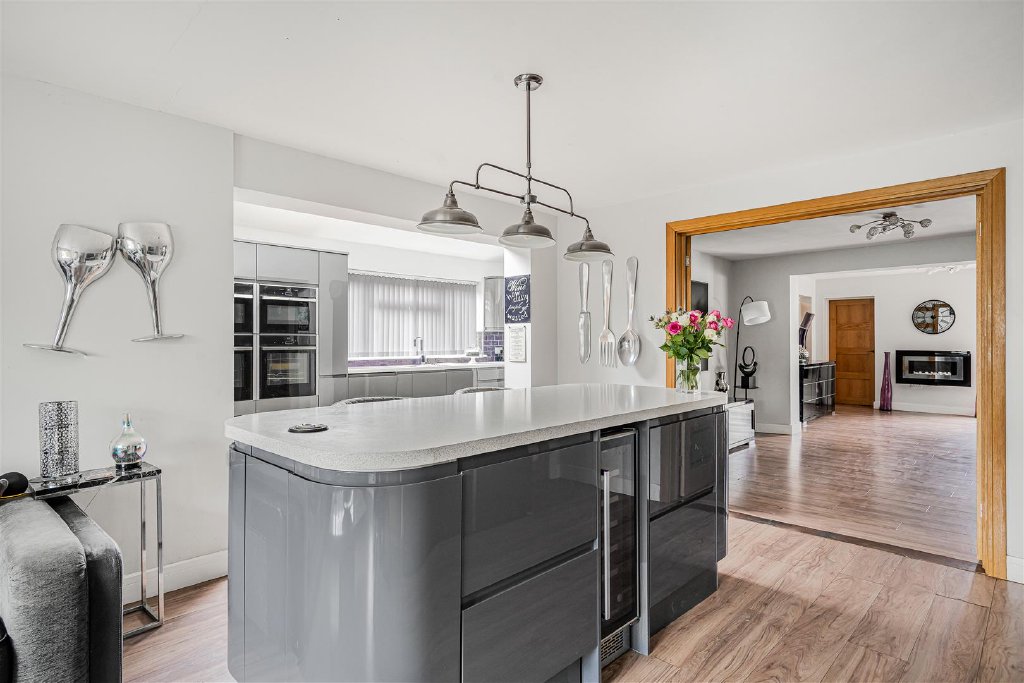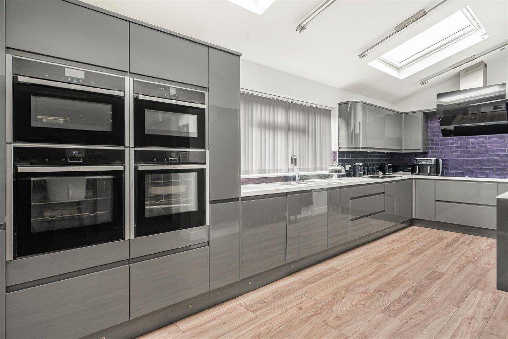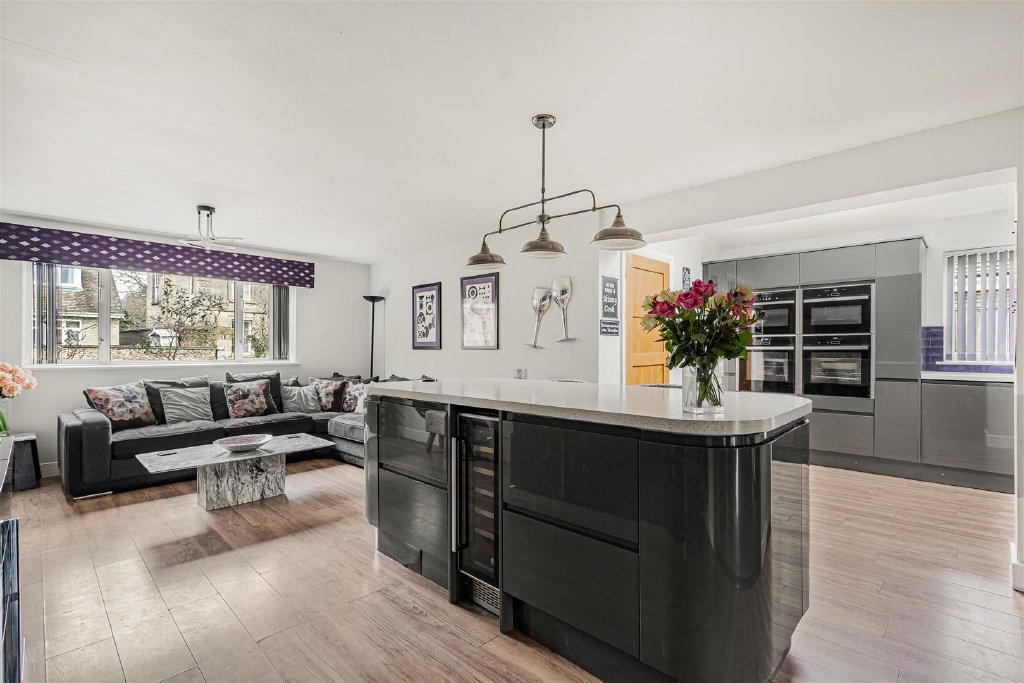 The kitchen is filled with natural light from two large skylight windows. Fitted with a generous number of contemporary units, including a central island with a wine cooler, and integrated appliances, there is plenty of space for preparing family meals.