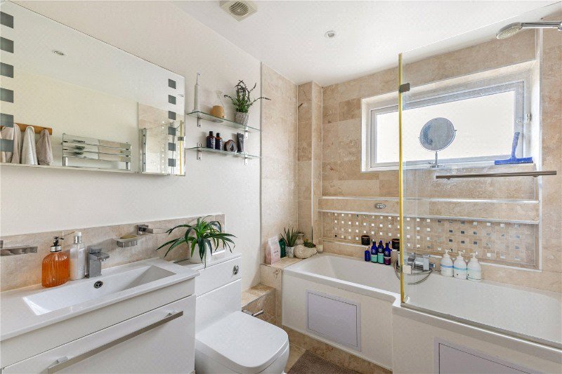 The ground floor comprises a spacious sitting room with direct access to the decked garden, a large separate kitchen / diner with large island seating four, and a guest WC. Real wood flooring throughout the ground floor, stairs and landing.