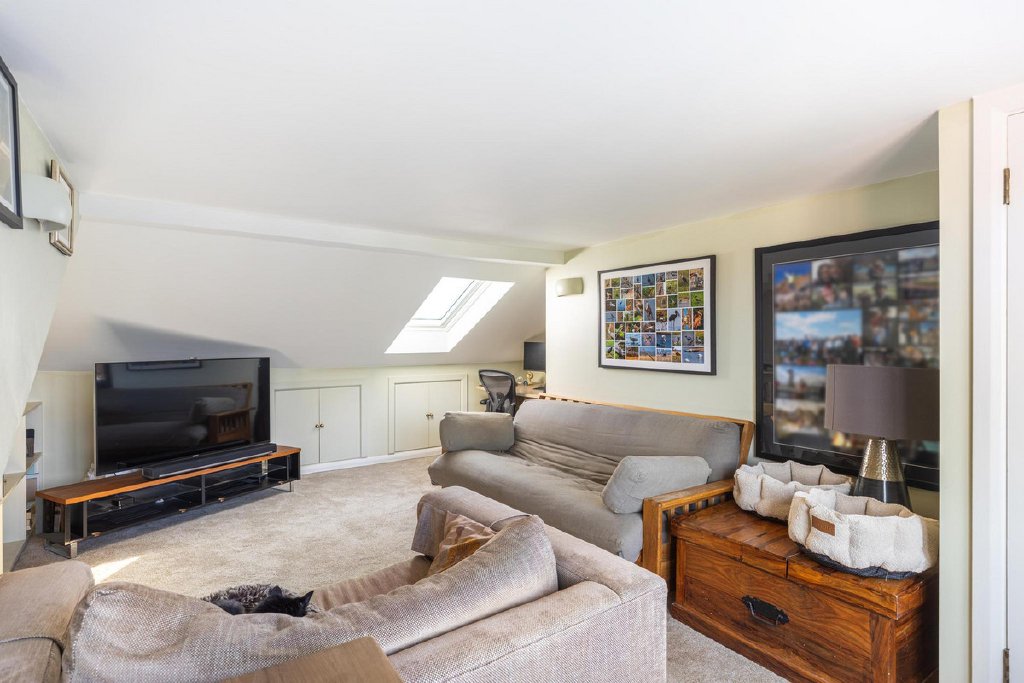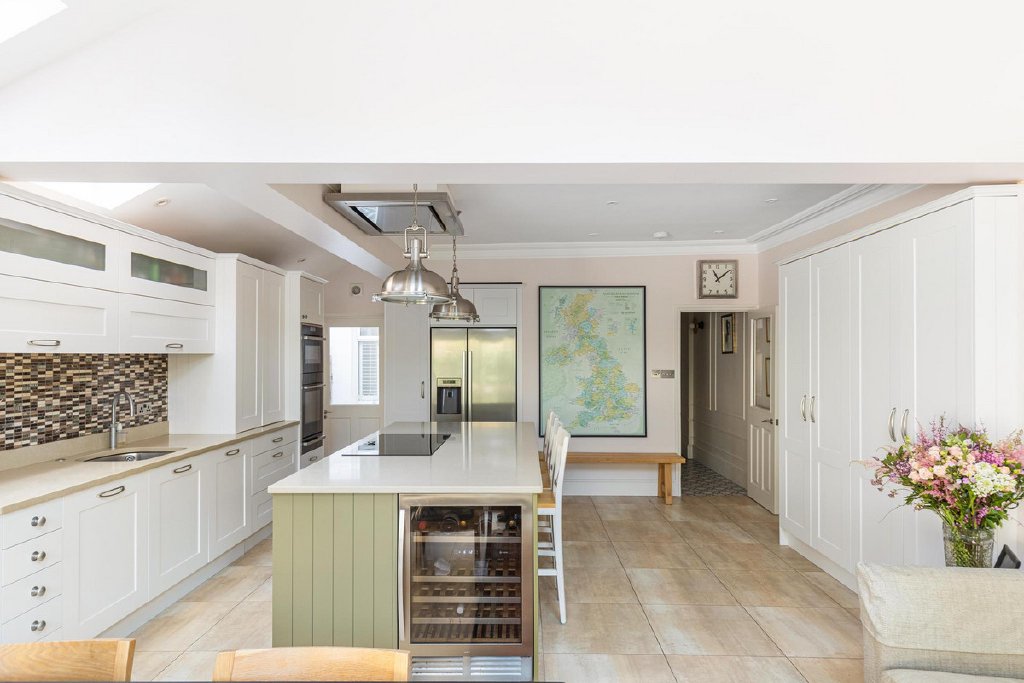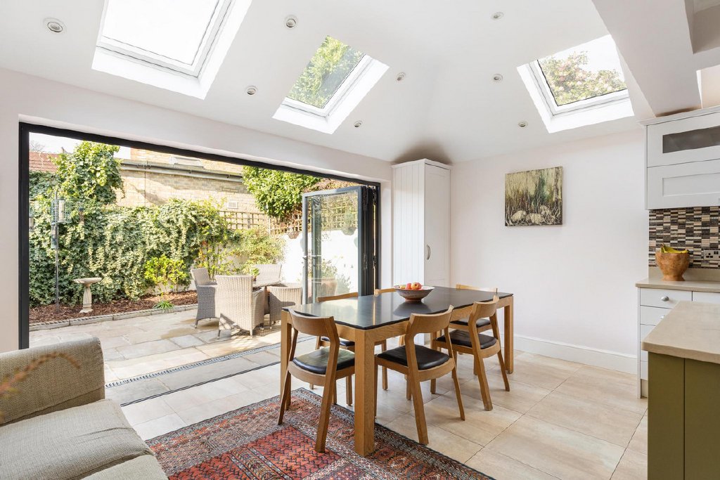 To the rear, the property opens into a magnificent, fully extended kitchen, now undoubtedly the heart of the home. Designed with both practicality and style in mind, it features extensive bespoke storage, a substantial central island and a dedicated dining area, perfectly suited to modern family life. Bathed in natural light from an array of skylights, this impressive space enjoys a seamless connection to the outdoors via bi-fold doors, which open onto a beautifully maintained, low-maintenance garden enjoying a sunny aspect, ideal for al fresco dining and summer gatherings.