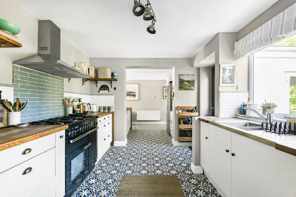 The kitchen has been fe-fitted with floor-standing units, a breakfast bar, and integrated appliances, along with space for a range cooker, and a large fridge freezer.