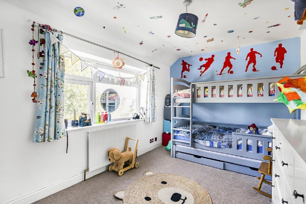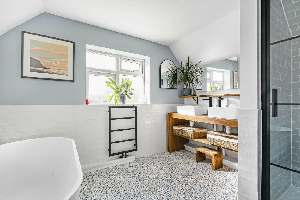 The master bedroom enjoys views over the lovely rear garden, and boasts fitted wardrobes along with a large en-suite, which has also been refurbished to include double sinks, a bath, and a shower.
