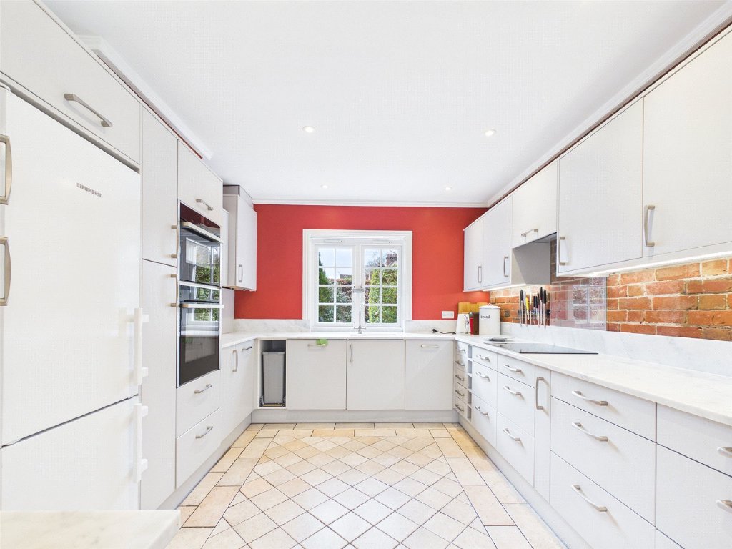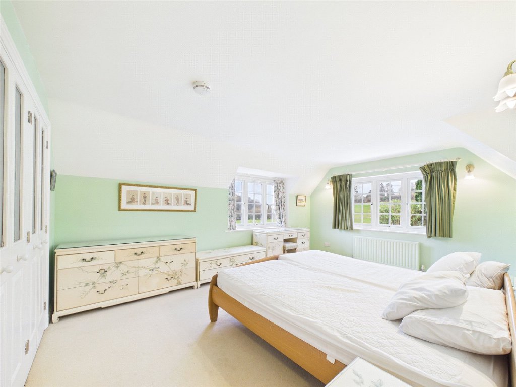 A large dual aspect Living Room features a red brick fireplace with a wood burning stove. Twin doors lead to a sizeable Conservatory enjoying an attractive outlook over the Garden and fields beyond.
