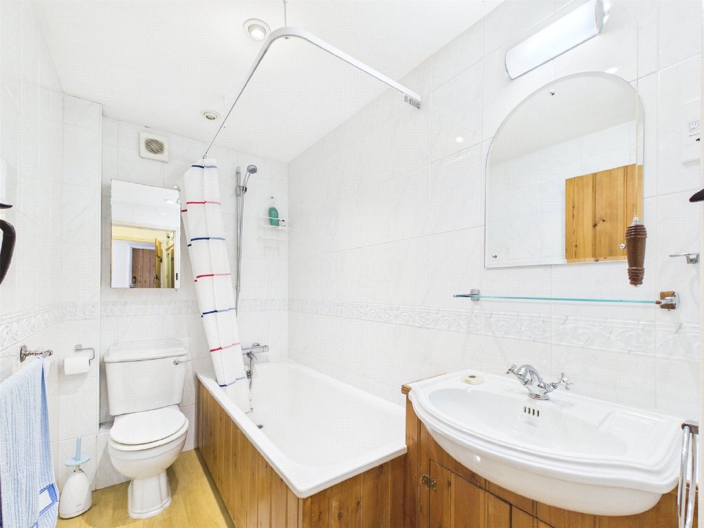 The principle Bathroom offers a matching white suite, complemented by a skylight.