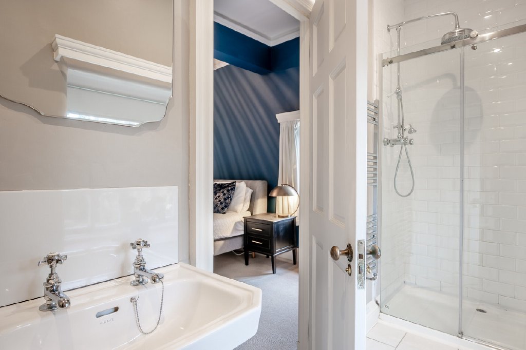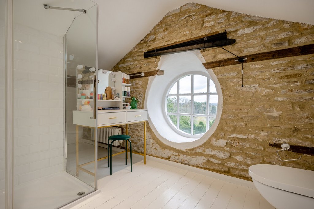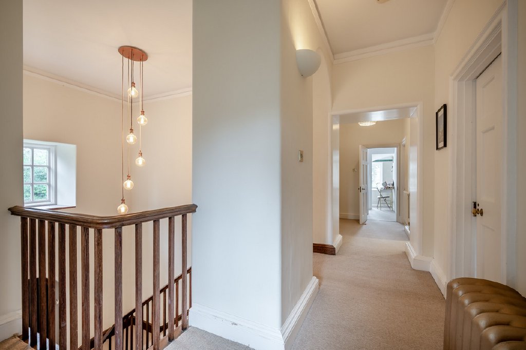 On the first floor is a wide central landing with a gallery area overlooking the front entrance hall and a further staircase leading up to the top floor suite. There are three double bedrooms on this floor, two have period fireplaces and the larger of the three has fitted wardrobes and an en suite shower room. There is also a luxurious family bathroom with a free standing roll top bath and a shower cubicle. On the top floor is a superb bedroom suite with exposed stone walls, beams and trusses, at opposite ends of the room are lovely circular windows. There is a large bedroom which leads through to a walk through wardrobe are and a modern en suite shower room with open views from the original circular window.