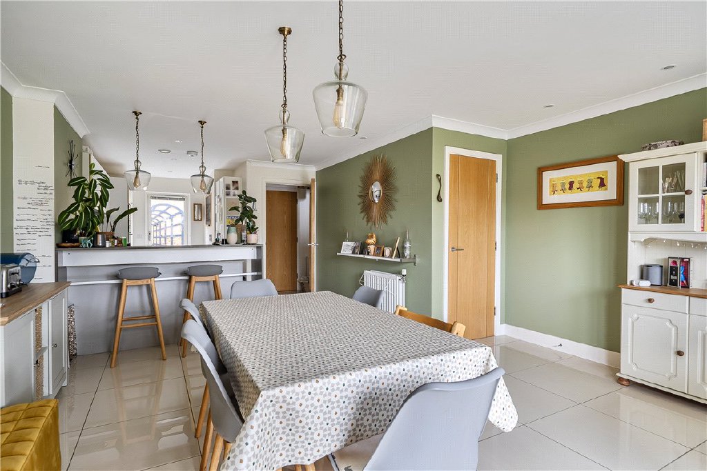 On the garden level there is a cloakroom which leads through into the open plan kitchen and dining space, arranged with a well fitted kitchen and breakfast bar. The kitchen includes modern cabinetry, integrated appliances and generous worktop space, while the adjoining dining area offers ample room for dining table and sofa. A door from the kitchen leads out to a south facing garden with a paved patio providing plenty of space for outdoor seating and dining and a garden layout that offers easy maintenance. A gate to the rear offers convenient access and leads to two off-street parking spaces to the rear.