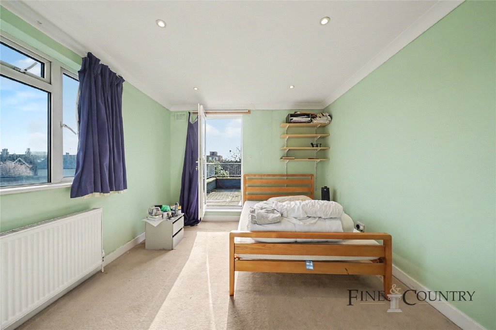 The upper floor continues the accommodation with three additional bedrooms arranged beneath the roofline. One of the bedrooms benefits from its own en-suite bathroom, while another opens directly onto a roof terrace, offering an elevated outdoor space with views across the surrounding rooftops.
