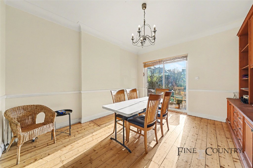 An entrance hall runs centrally through the plan, creating a natural axis that connects the principal rooms. At the front of the house, a bay-fronted living room forms the first of the principal reception spaces. The wide window draws daylight across the timber floorboards, while a fireplace sits centrally along the inner wall, creating a natural focal point within the room. A broad arched opening connects the living room to the adjoining dining room, allowing the spaces to flow together while still retaining their individual character. Positioned toward the rear of the plan, the dining room is arranged beside large glazing overlooking the garden, where natural light filters through the depth of the house and reinforces the connection between the interior and the outdoor space.