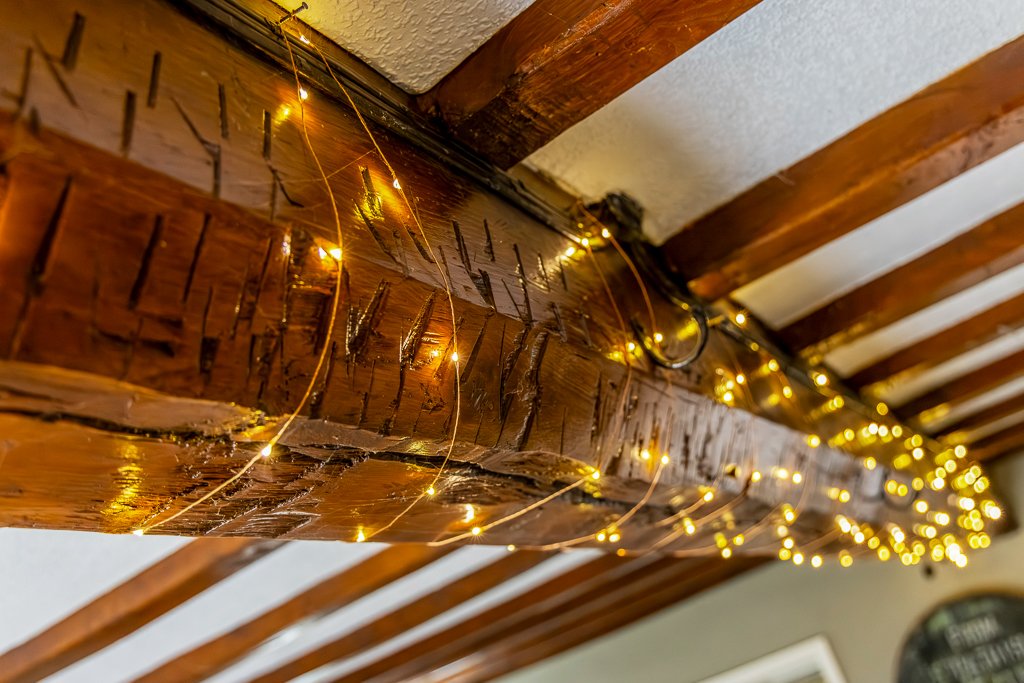 - Bright dining room with decorative fireplace, exposed beams & under stairs storage