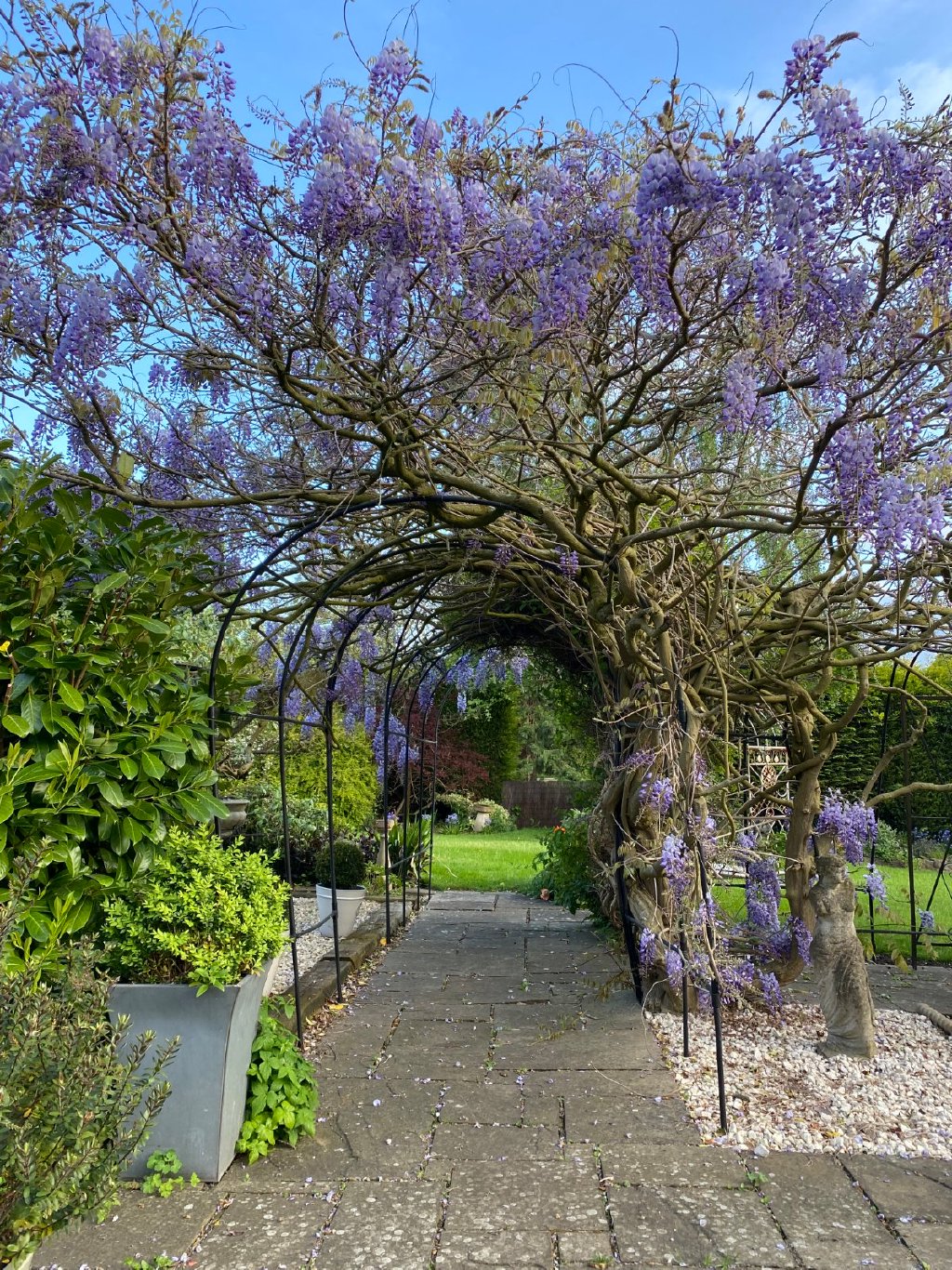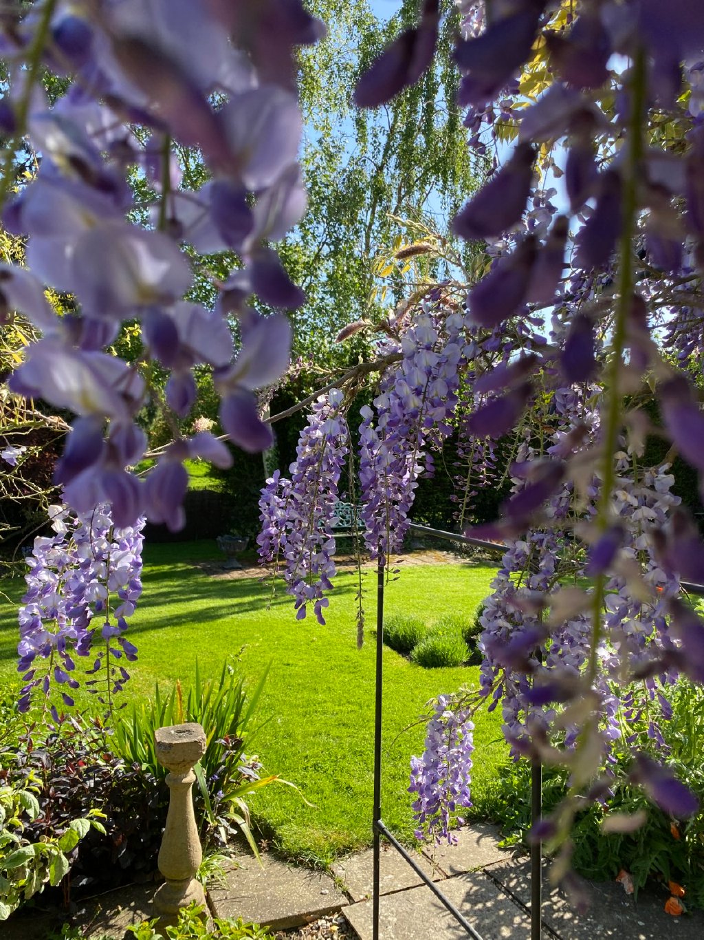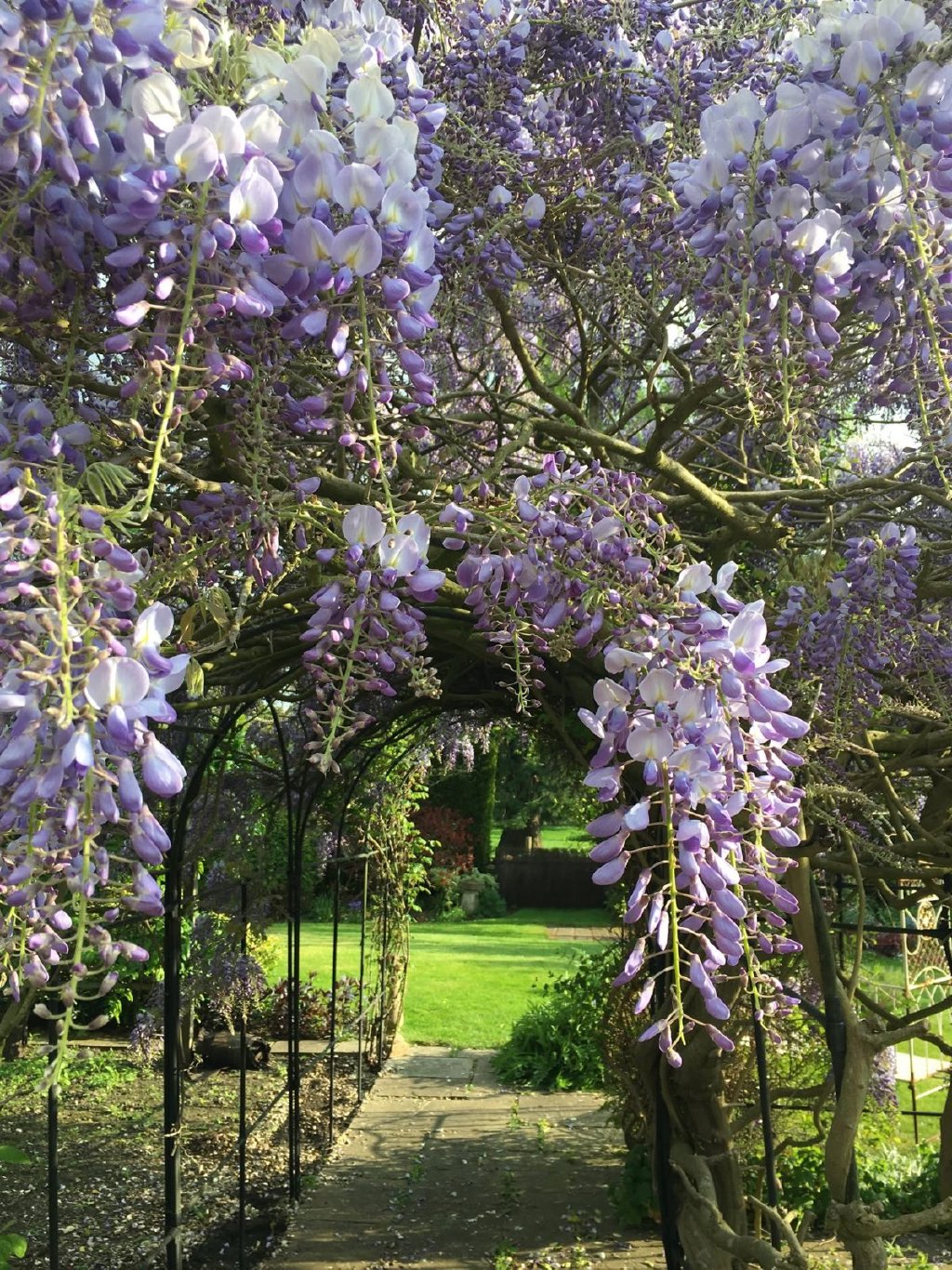 One of the features we have enjoyed most is the larger garden area located across the quiet footpath to the front of the cottage. The previous owners, who lived here for over thirty years, acquired this additional space from the Leadenham estate and we have enjoyed creating a beautifully landscaped cottage garden. It is filled with mature shrubs and borders, and the stunning wisteria-covered arbour flowers twice a year. The garden backs onto village common land where sheep and horses sometimes graze, and there is often a great deal of local wildlife, including buzzards and deer.