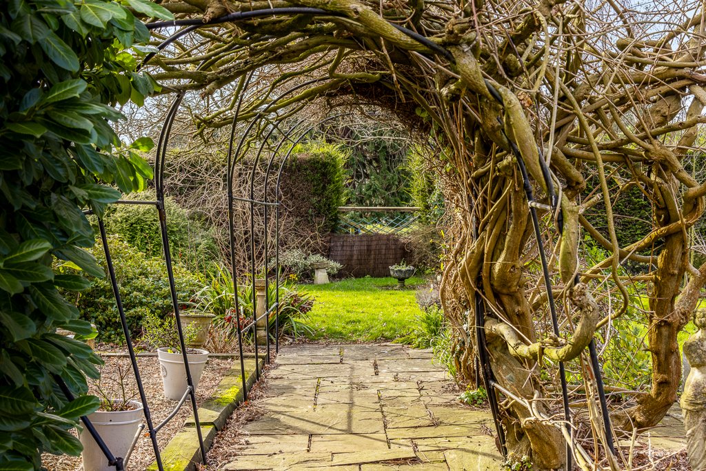 A charming courtyard garden leads to a secluded gravelled seating area, enclosed by stone walling, mature hedging and fencing. The extensive lawned garden is bordered by established trees and shrubs, with well-stocked beds, patio seating areas and a beautiful wisteria-covered arbour arch.