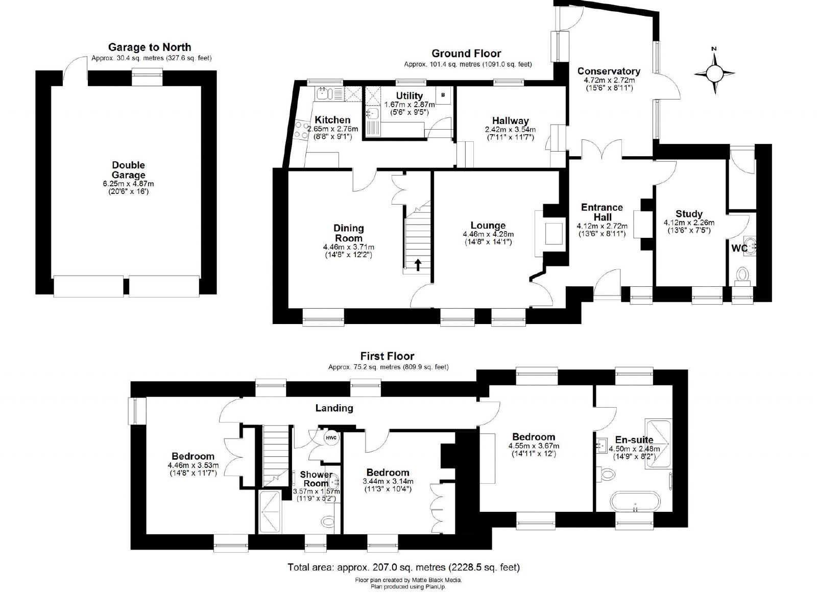 The first floor offers three generously proportioned bedrooms, each benefiting from built-in wardrobes. The principal bedroom enjoys views over the garden and features a spacious en-suite bathroom. The remaining bedrooms are served by a well-appointed shower room.