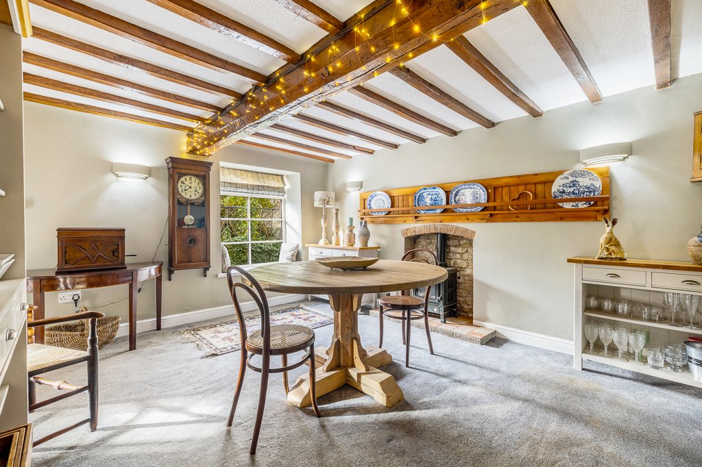 • Bright dining room with decorative fireplace, exposed beams & under-stairs storage