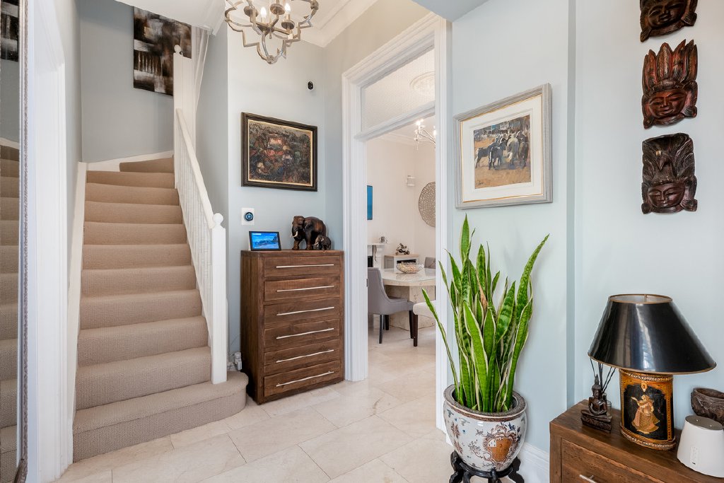 The welcoming entrance hall immediately sets the tone for the home, with elegant proportions, tiled flooring and attractive stained-glass detailing to the front door and windows.