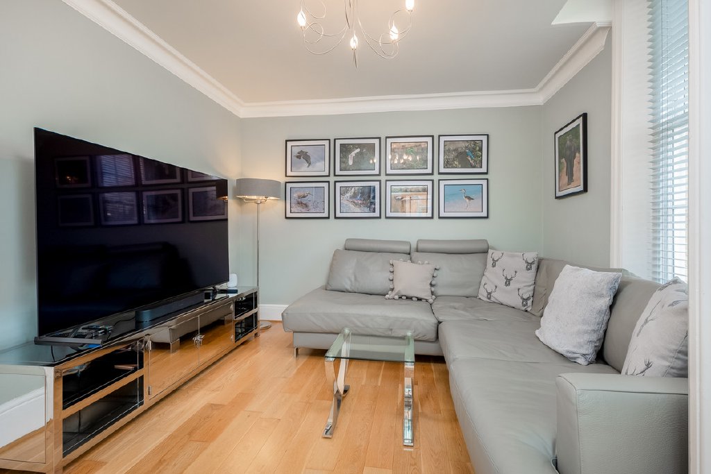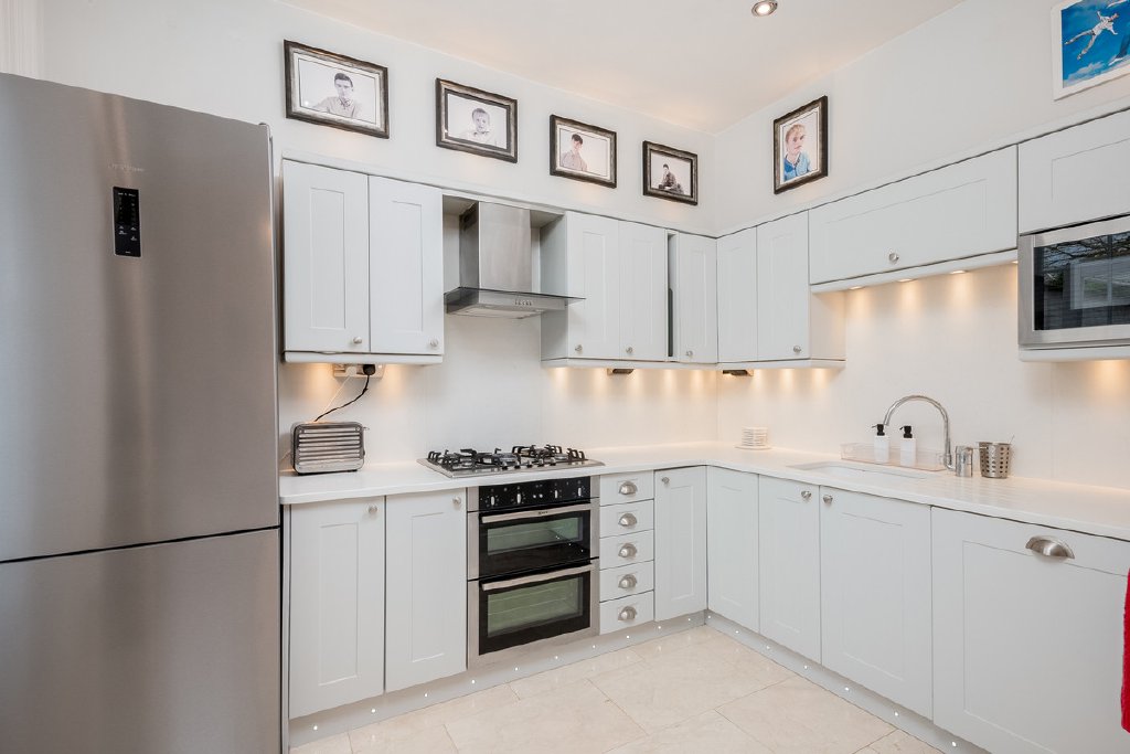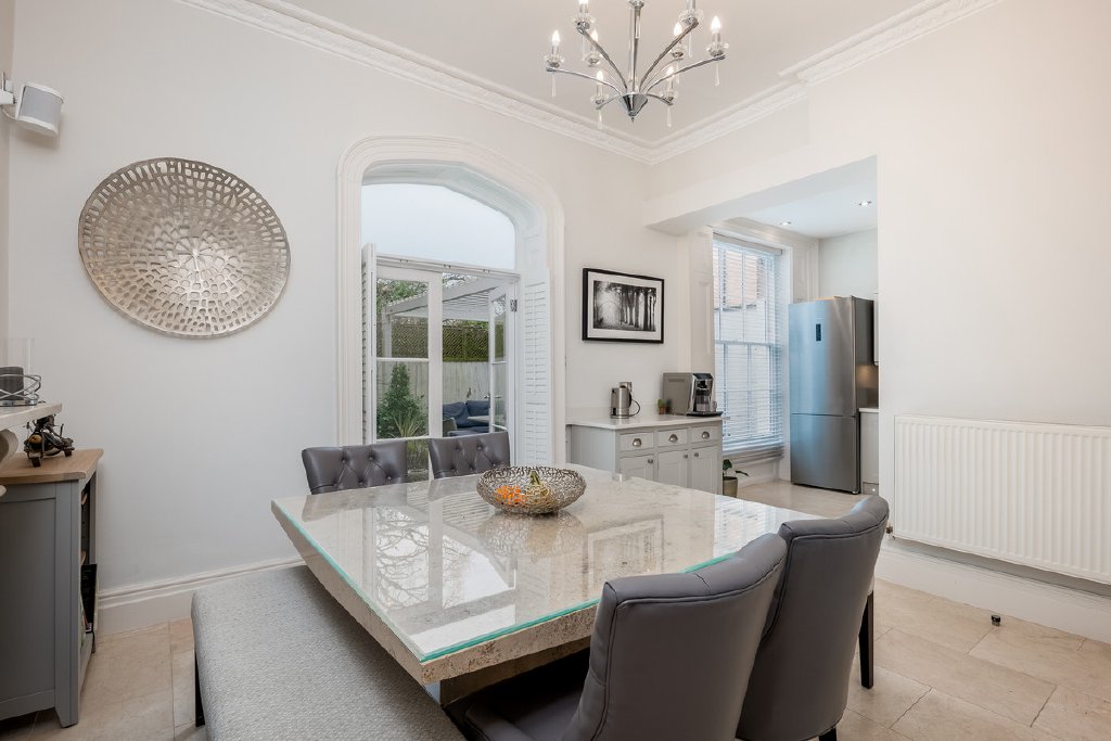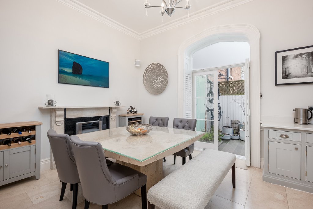 To the rear of the property lies the fabulous kitchen and dining room, forming the social heart of the home. The kitchen is fitted with a range of shaker style cabinets, integrated appliances and generous worktop space, while the dining area comfortably accommodates a large table for family meals and gatherings. French doors provide access to the courtyard garden beyond, and large sash windows flood the area with natural light.