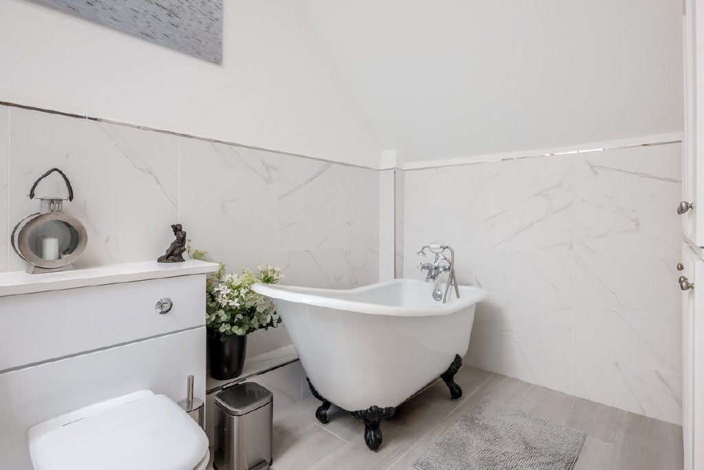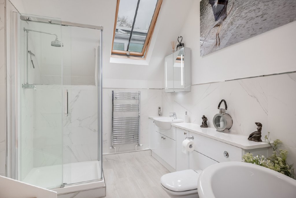 The family bathroom in flooded with light from a skylight above and features both a freestanding roll top, claw foot bath and a separate shower.