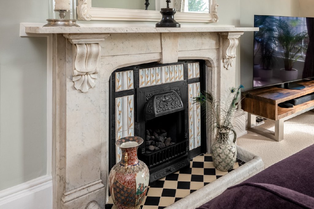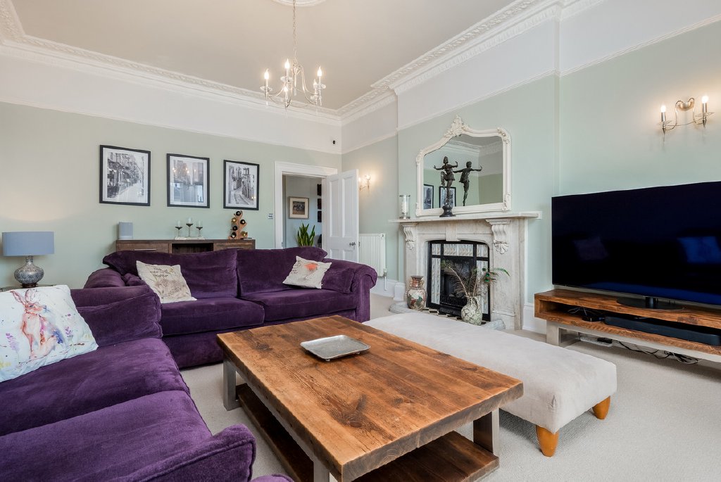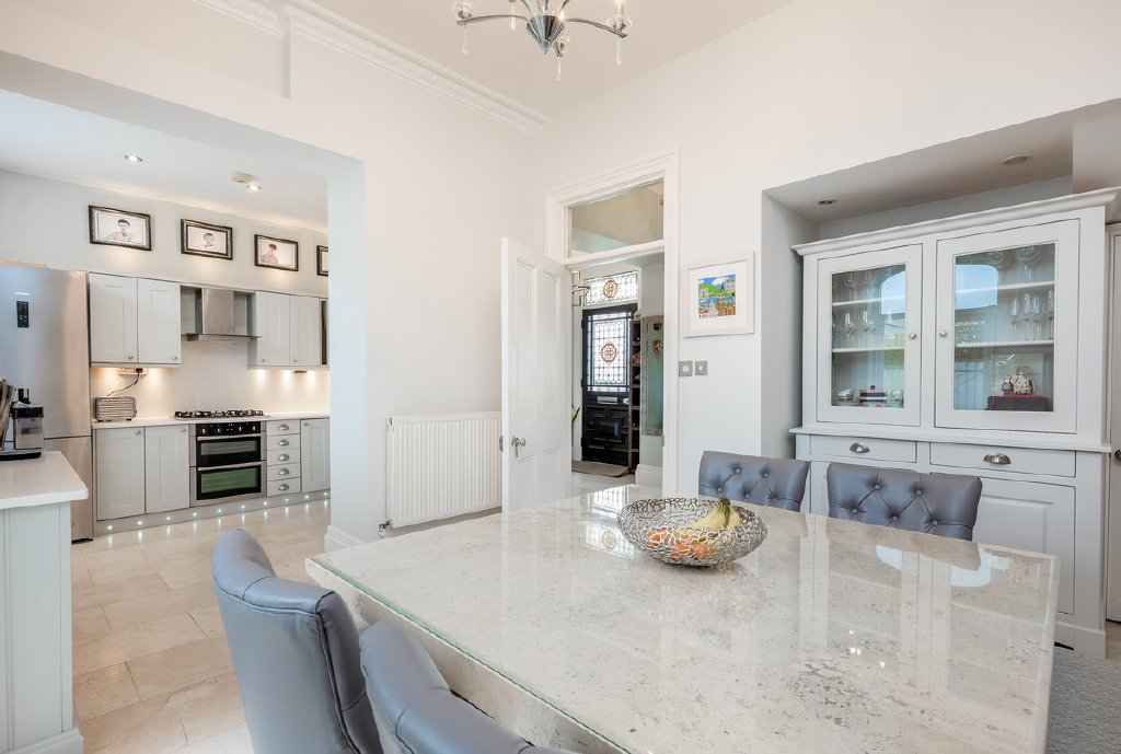 To the front of the property is the impressive living room, a beautifully proportioned space featuring a striking bay window, high ceilings with decorative cornicing and a feature fireplace which creates a wonderful focal point. Flooded with natural light, this room provides an elegant setting for relaxing or entertaining.