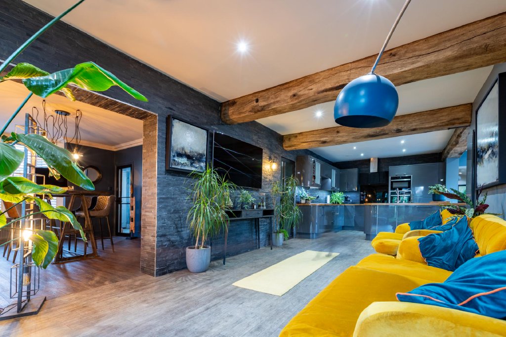 Accessed from the inner hallway through an attractive Crittall-style doorway, the truly spectacular living room is revealed. This impressive space features a vaulted, beamed ceiling and exposed brickwork, creating a wonderful sense of character and scale. At its centre sits a stunning inglenook fireplace with multi fuel log burner, forming a striking focal point and bringing warmth and charm to this remarkable room. Feature glazed archways overlook the central courtyard, flooding the room with natural light and providing an attractive architectural detail. A door also leads directly out to the garden, enhancing the connection between indoor and outdoor spaces. The room is presently arranged as a spacious living and dining area, perfectly suited to entertaining family and guests.