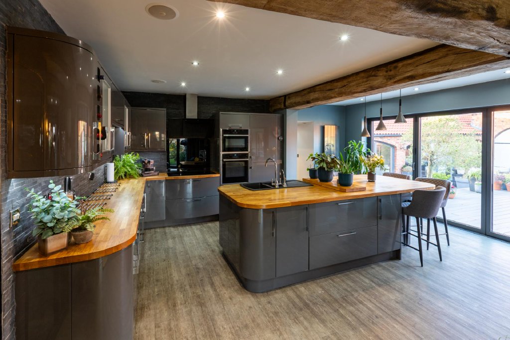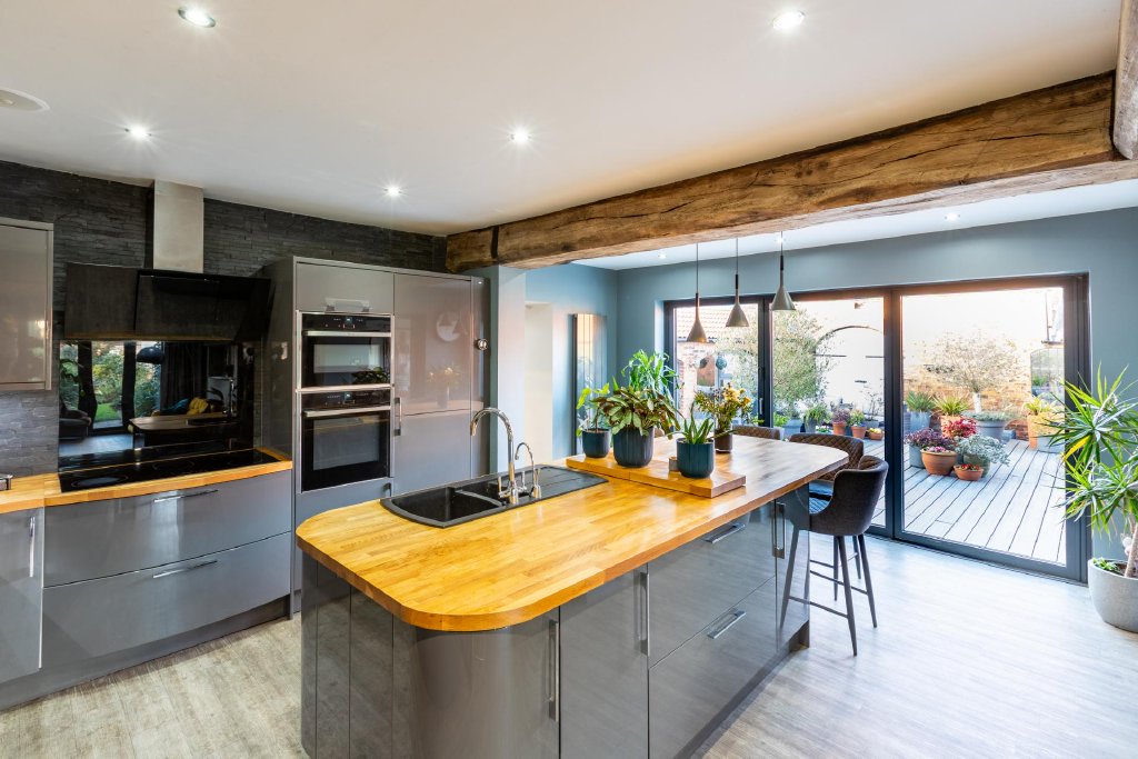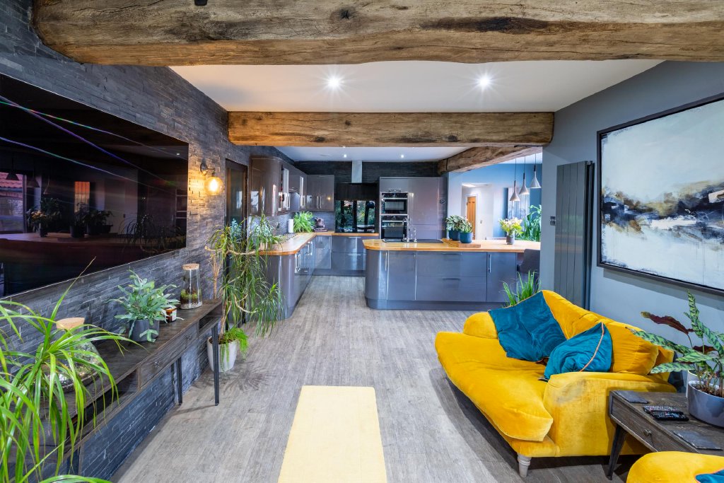 Both rooms flow naturally into the bright and spacious open-plan kitchen and living area, the true heart of the home, where character meets contemporary design. Exposed beams add warmth and charm, while bespoke high-gloss base and wall units are complemented by wooden work surfaces, creating a stylish yet practical environment. A central island provides the perfect setting for informal dining and socialising, while a range of integrated appliances ensures the space is both functional and beautifully appointed. To the rear, large bi-fold doors open directly onto the courtyard, allowing natural light to flood the room and creating a seamless connection between indoor and outdoor living. A generous seating area with space for a television further enhances this area, making it a wonderful setting for relaxation and entertaining.