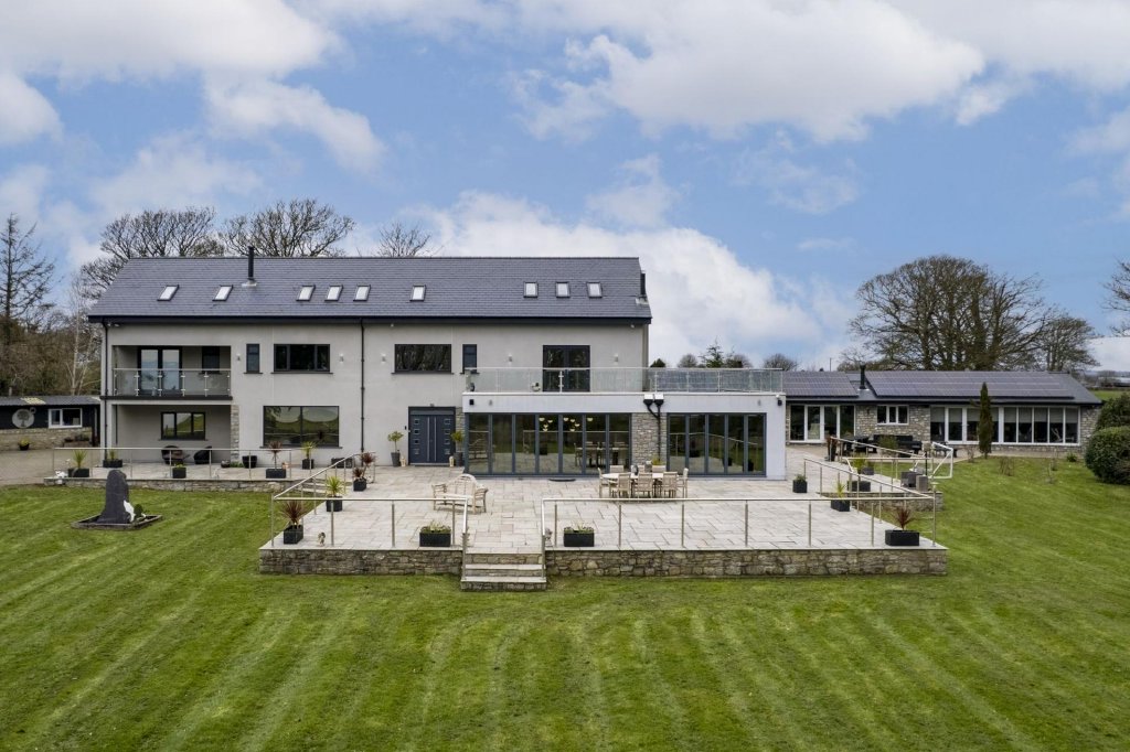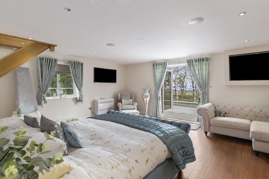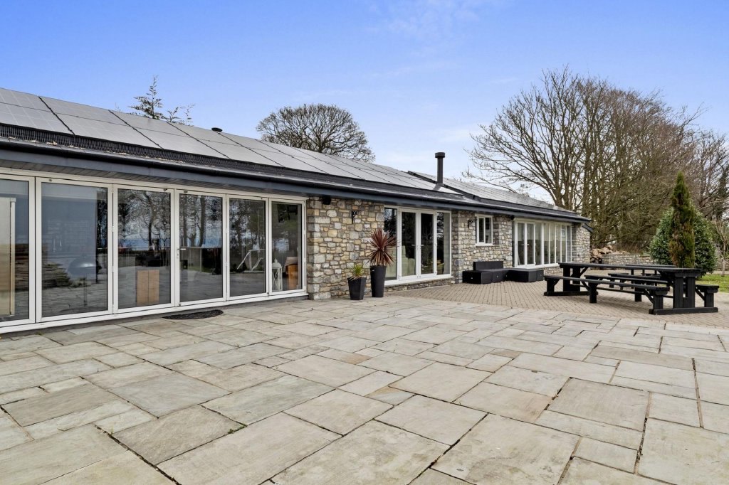 The outdoor spaces at Yr Berllan Fach are just as impressive as the interior. Set within 1.5 acres of beautifully landscaped gardens, the grounds offer complete privacy, with a mix of mature trees, lawns, and stunning slate stone terraces. The raised front terrace is perfect for entertaining, accessible directly via bi-fold doors from the living room, and is complemented by an outdoor kitchen and bar area for al fresco dining. A large detached annexe provides an ideal space for leisure, with a full gym, sauna, and a fitted bar with projector and screen for entertainment. Whether you're enjoying a peaceful evening overlooking the sea or hosting a large gathering, the outdoor areas are designed to take full advantage of the spectacular surroundings.