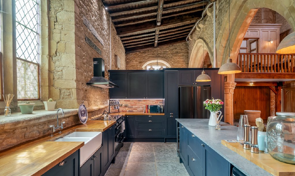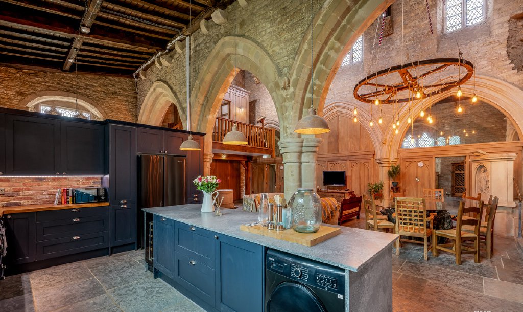 The nave is now the heart of the home with a spectacular vaulted ceiling, with the kitchen one side and living areas opposite. For such a vast, voluminous space, it’s surprisingly homely, and would work very well for both everyday family life and entertaining friends. The kitchen is the most modern area, fitted with a range of bespoke navy-blue cabinets, chestnut worktops, and an island with stone surfacing. It’s well equipped, with a double ceramic butler sink and either freestanding or integrated appliances (appliances available by separate negotiation). The utility at the base of the bell tower matches the kitchen, and here there’s a ceramic Belfast sink and more storage.
