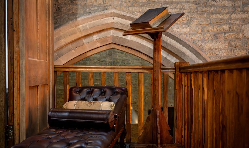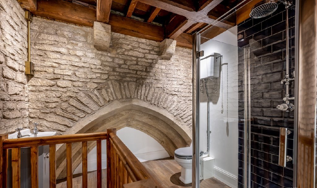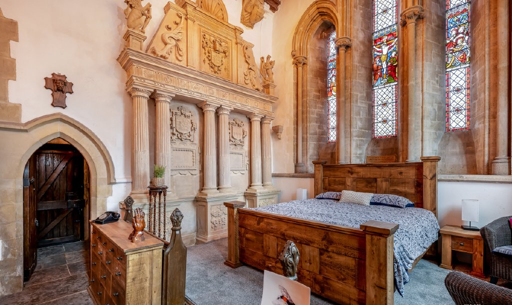 As for features, the list is extensive, and some such as the Archer which sits proudly in the main entrance hall pre-date the building itself. Throughout this stunning home there are grand arches and small alcoves, stained glass windows and a medieval mural, there are also many monuments, including one of a praying William Montagu and a phenomenal Montagu tomb. The font and the pulpit are positioned in the main living space, angel corbels watch over the primary bedroom, and there are interesting light fittings made from bell ropes and wheels.