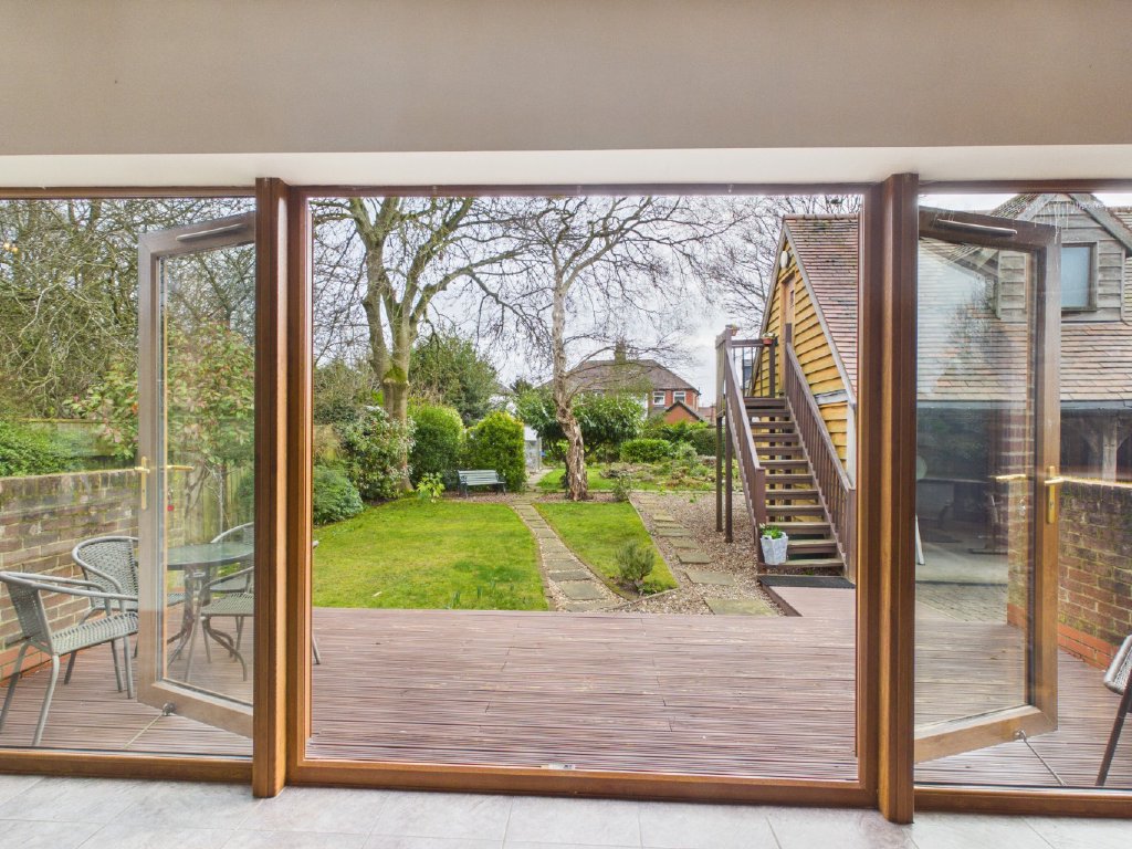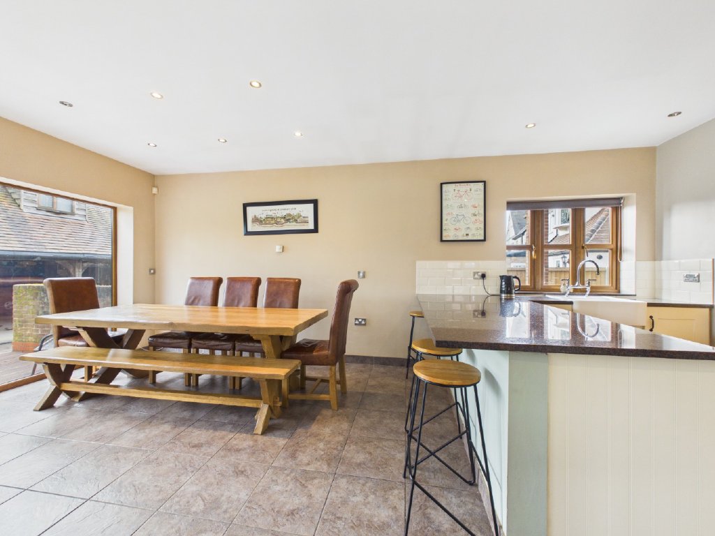 The kitchen and dining area form the natural heart of the home. Designed with both everyday living and entertaining in mind, the space enjoys excellent natural light and direct access onto a raised decking area, perfect for relaxed summer evenings overlooking the gardens.