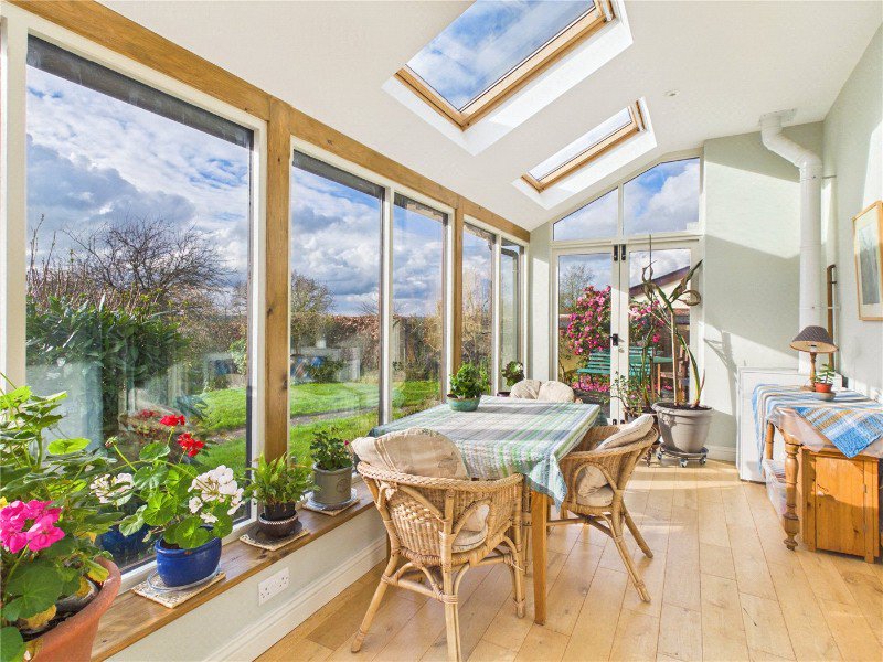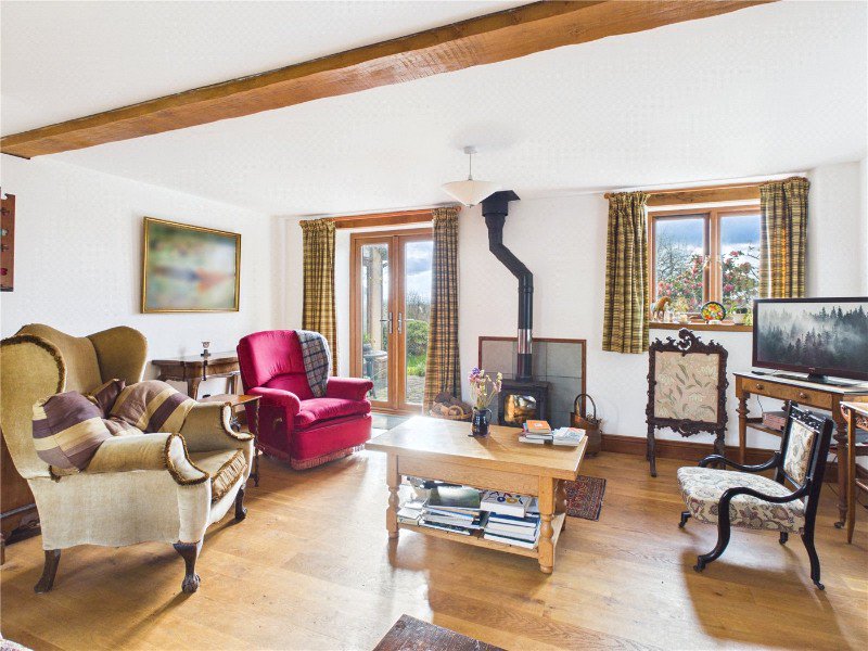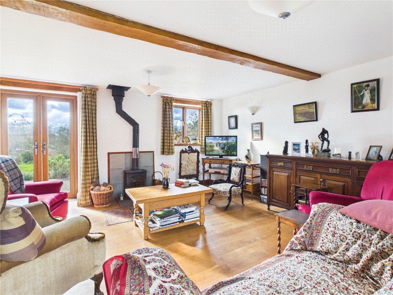 The well-proportioned layout includes four bedrooms, a bright dual-aspect sitting room with wood burner, a dining room, a farmhouse-style kitchen, a striking garden room, a family bathroom, and a principal bedroom with ensuite.