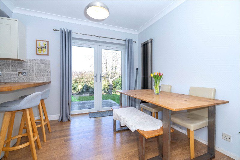 18’7 x 9’1 a cleverly reconfigured space, opened up to maximize space with UPVC window to the rear aspect and UPVC French doors onto the gardens, comprising a range of refitted base and eye level storage units incorporating solid wood work surface with 1 ¼ sink inset and mixer tap over, integrated double oven and four ring hob, integrated dishwasher, and integrated fridge, ample space for a dining table, vertical radiator, power points and finished with wood effect flooring