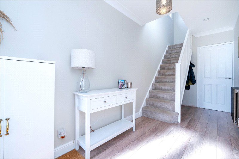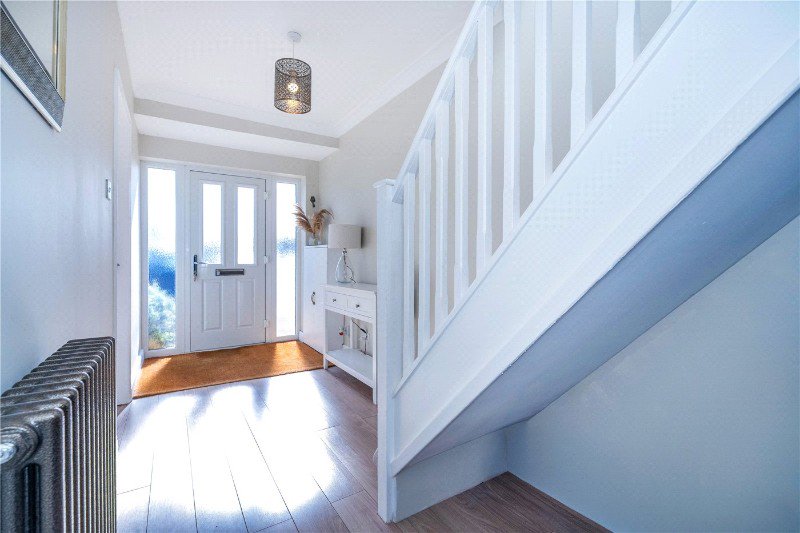 a long light reception hall greets you with dual UPVC panels to the front aspect, centralizing the entrance, with stairs to the first-floor accommodation, radiator, power points and finished with wood effect flooring.