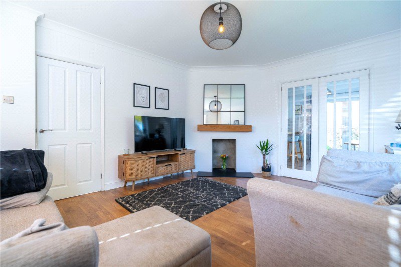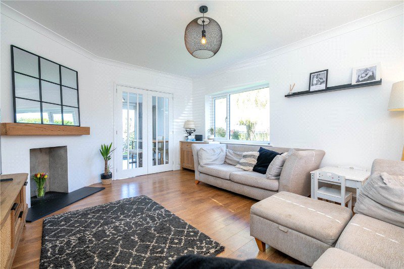 14’2 (excluding bay) x 12’2 a lovely bright space with UPVC box bay window to the front aspect and further UPVC picture window to the side overlooking the wrap around gardens, feature fireplace with timber mantle over, radiator, power points, TV point and wood effect flooring, opening through to: