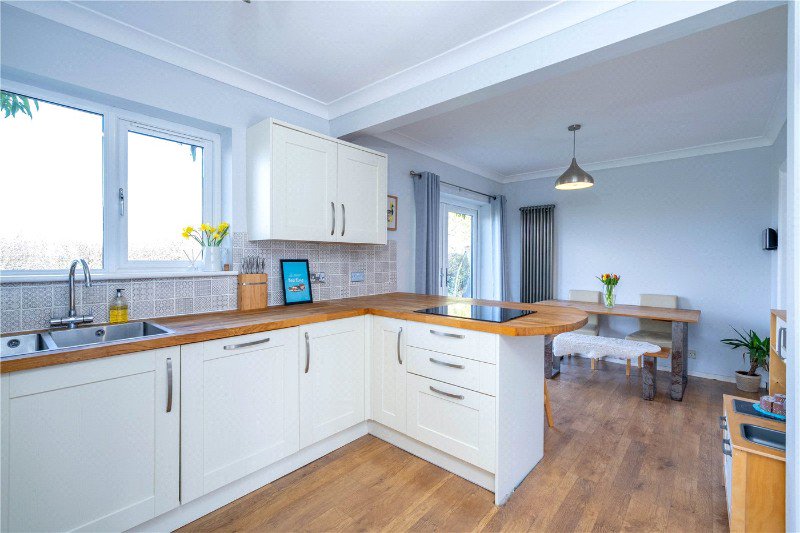 10’1 x 7’8 a handy addition to the accommodation with UPVC window to the rear aspect and part glazed UPVC door onto the gardens, comprising a range of refitted base and eye level storage units, incorporating roll edge work surface, plumbing and space for washing machine, space for tumble dryer, power points, ceiling spotlights and wood effect flooring