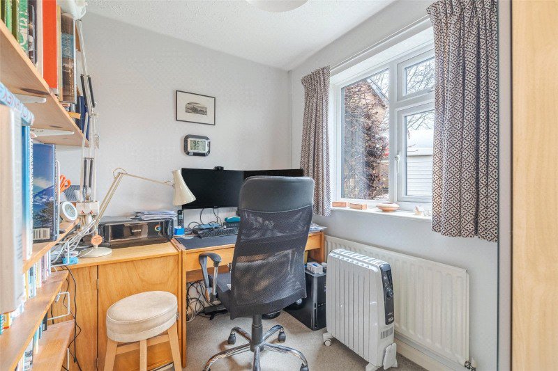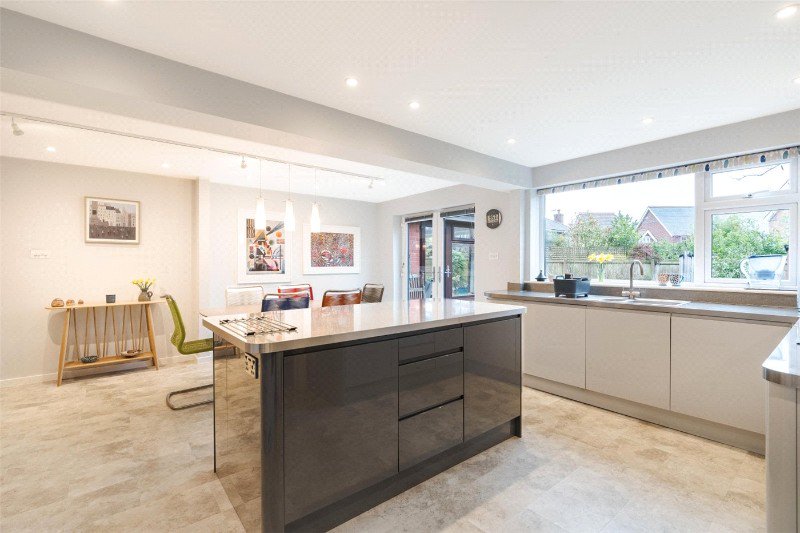 The bright, spacious living room has been extended to create 2 sitting areas. The main living area has a contemporary wall mounted gas fire, and the second sitting area enjoys double aspect windows overlooking the rear garden, vaulted ceiling and a feature stained glass porthole window. There is a study to the front elevation.