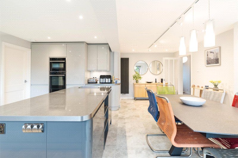 The stunning kitchen/dining room comprises an excellent range of contemporary Wren gloss units, complimentary worktops, feature central island, stainless steel sink, induction hob with extractor over, Neff oven, microwave/combination oven and warming drawer, integrated dishwasher and fridge/freezer, useful large walk-in pantry, door to garage, French doors to the garden, and door to utility room. The utility room has a range of cream Shaker style units, stainless steel sink, space for washing machine and tumble dryer, and a Viessmann boiler (serviced annually).