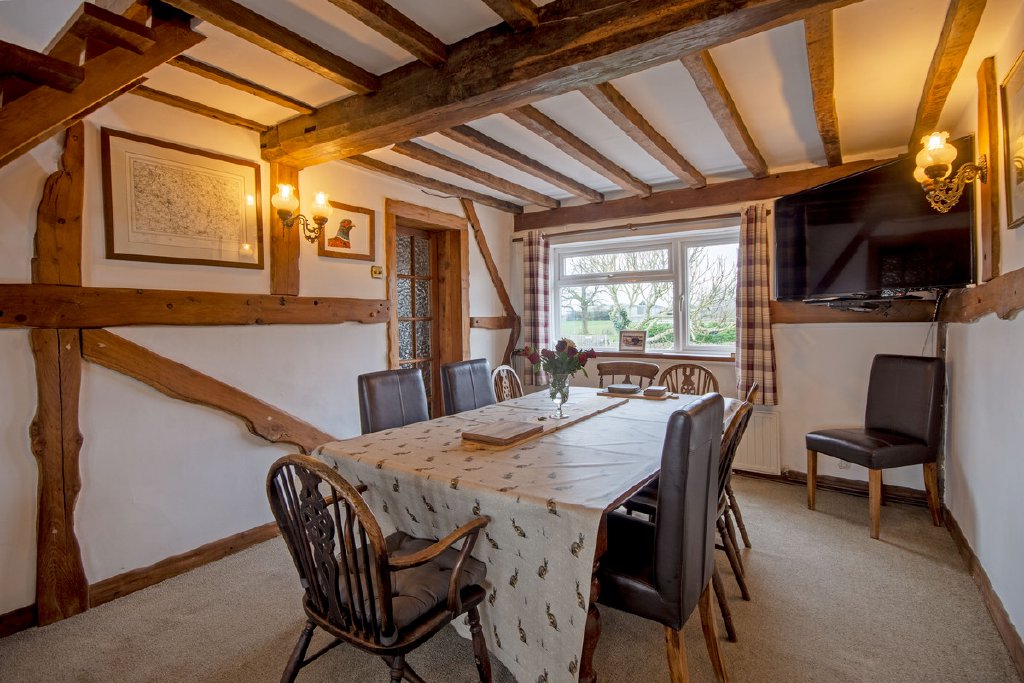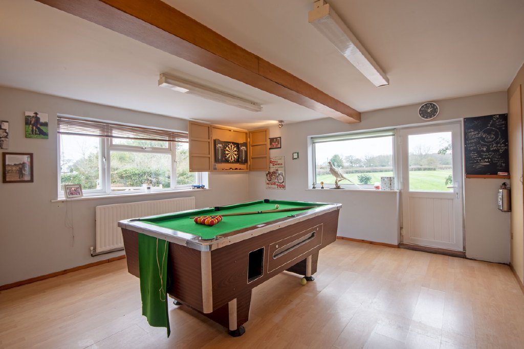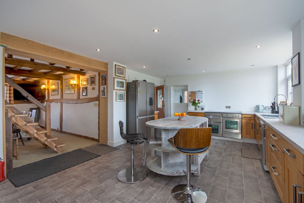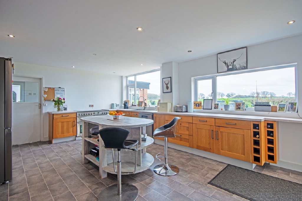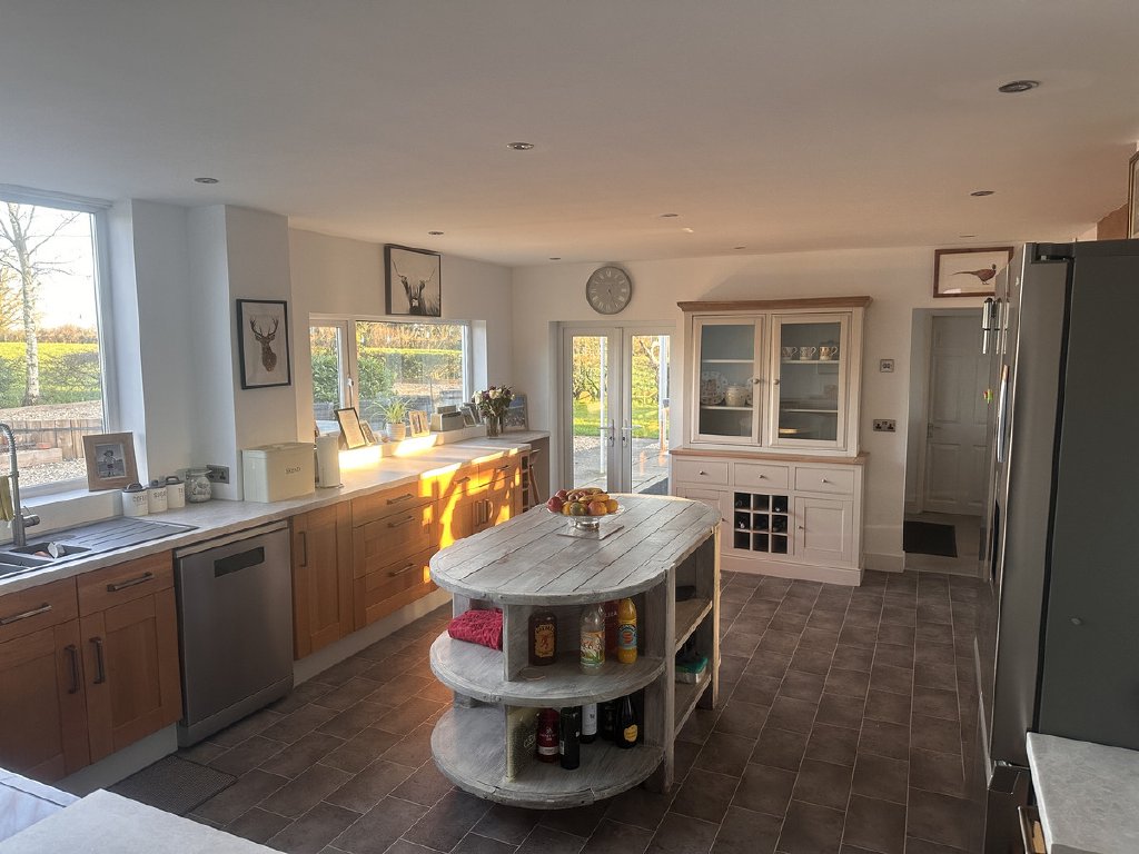 Ground Floor: Entering through the side entrance, you are welcomed into a reception room currently arranged as a games room, featuring dual-aspect windows that provide excellent natural light. This space flows seamlessly into the open-plan kitchen and dining area, where two large picture windows frame views of the surrounding countryside. The kitchen is centred around a stylish island and benefits from double-glazed doors that open directly onto the garden. The dining area is full of character, enhanced by exposed beams and a striking wooden staircase that creates an attractive focal point. Adjacent to the kitchen is a utility room with a door leading outside, along with a convenient ground-floor shower room.