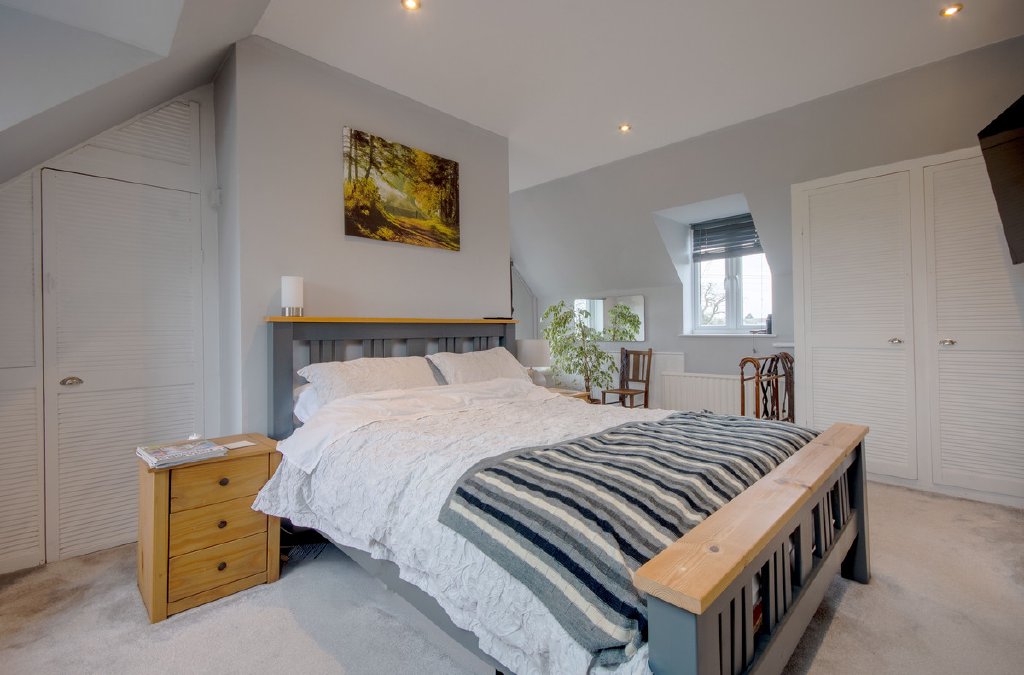 The spacious principal bedroom features an open-plan ensuite area with a freestanding bath, fitted wardrobes and a Juliette balcony. Bedroom two benefits from its own shower and wash basin, while bedroom three is fitted with a wash basin.