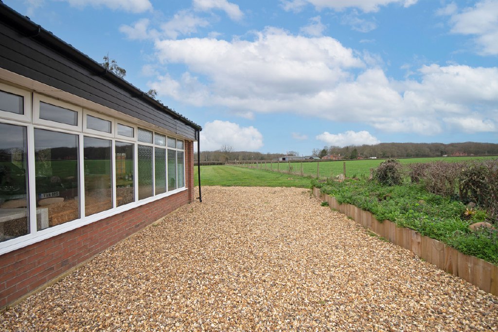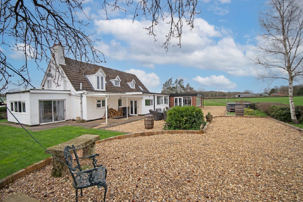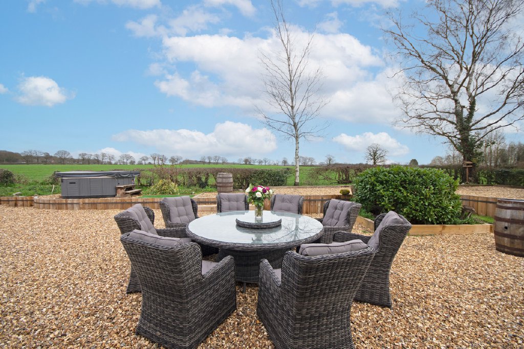 To the side of the property is a lawned garden which wraps around to the rear, where it transitions into an attractive gravelled entertaining area with a seating space and hot tub, perfectly positioned to enjoy the open views across the surrounding fields. To the right of the property lie the lawns of approximately one acre, offering excellent additional outdoor space.