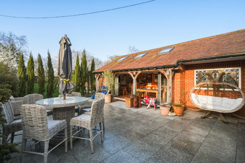The property is approached via a shingle driveway offering parking for several vehicles and a double garage. There is a main front door and another door set back from the driveway which gives access to the rear of the home. A side entrance leads to the impressive entertaining patio and a good size rear garden laid mainly to lawn with mature trees.