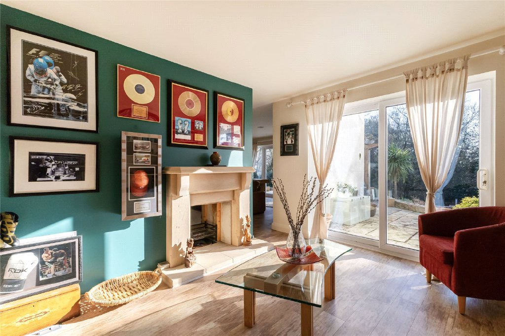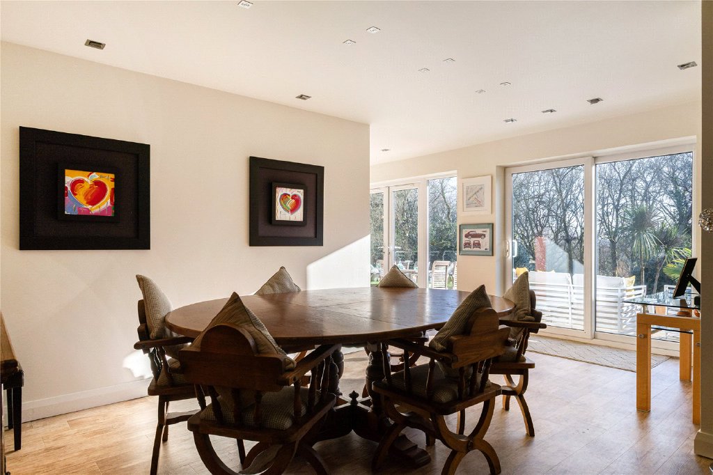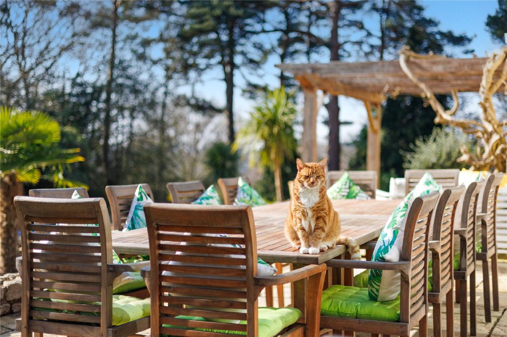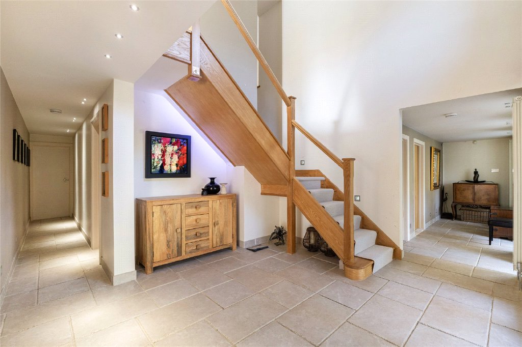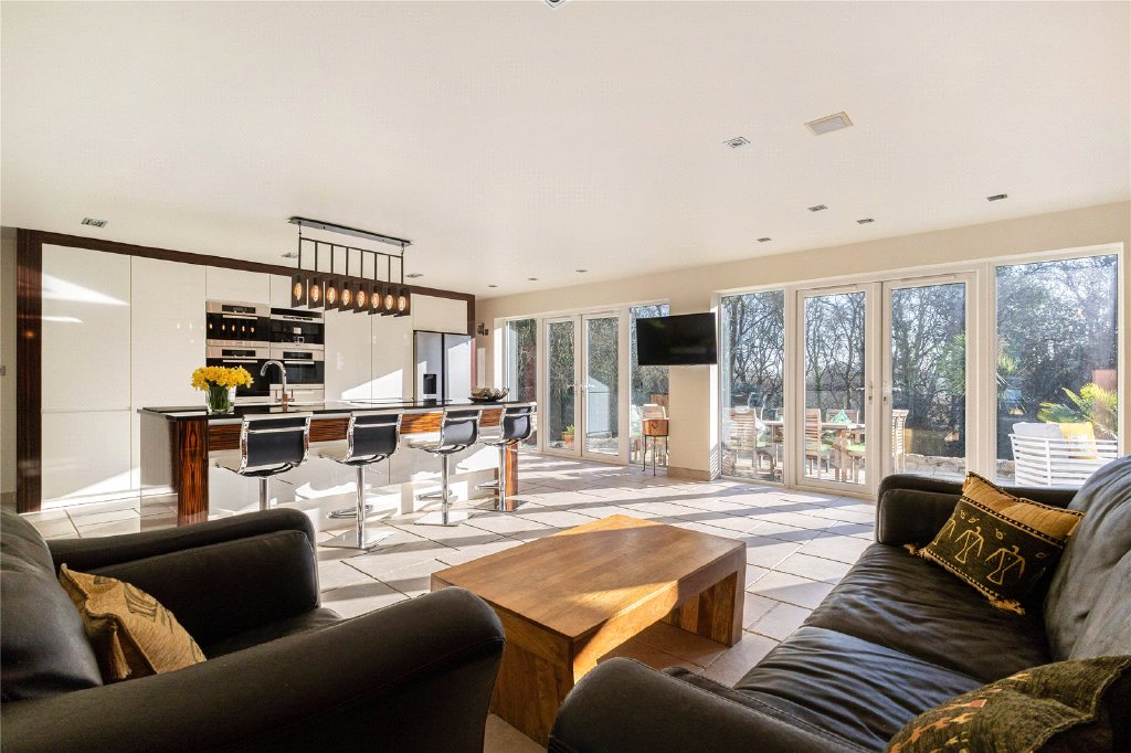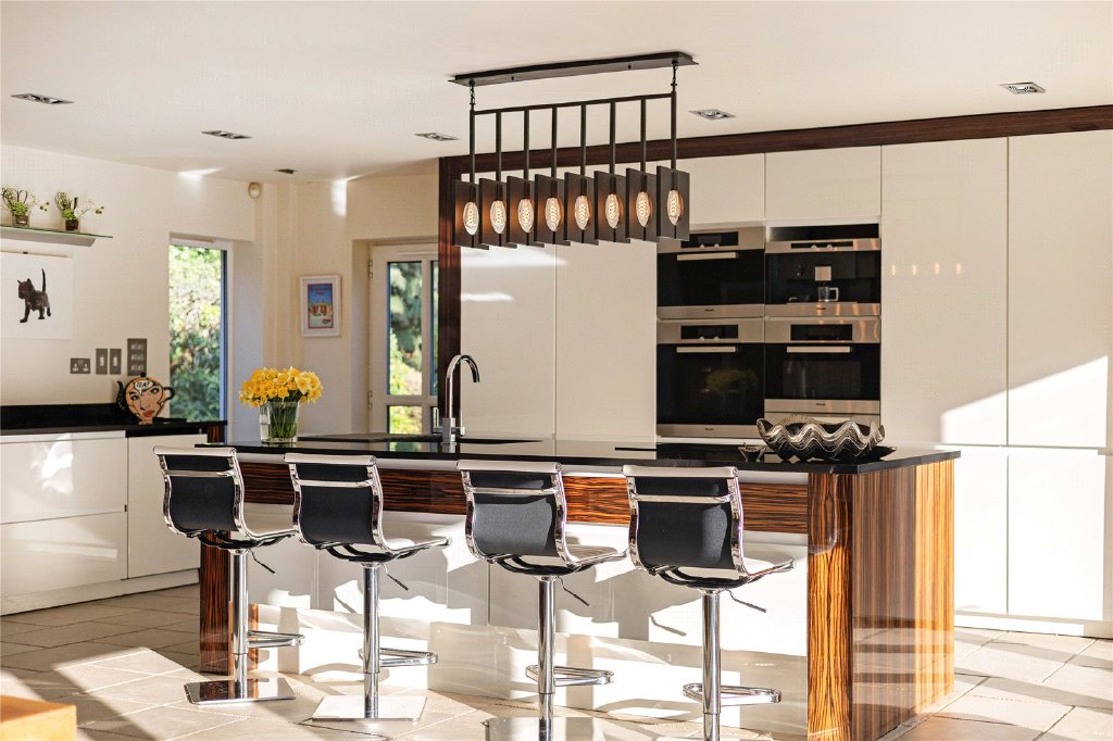 The kitchen is equally impressive, beautifully designed and centred around a substantial island, creating a natural gathering point within the home. Large windows frame picturesque views across the stunning gardens, while French doors open directly onto south-facing terracing and seating areas. The kitchen and principal living spaces all enjoy access to these sun-filled outdoor areas, creating a seamless transition between indoor and outdoor living and providing a superb setting for al fresco dining, entertaining and relaxed family life.