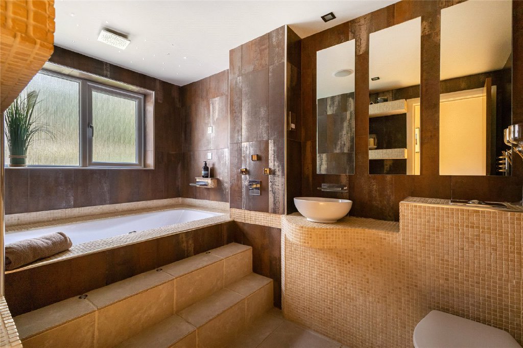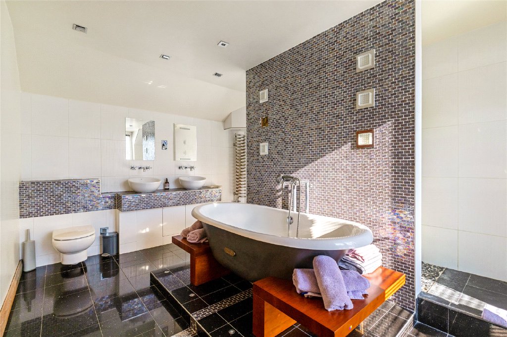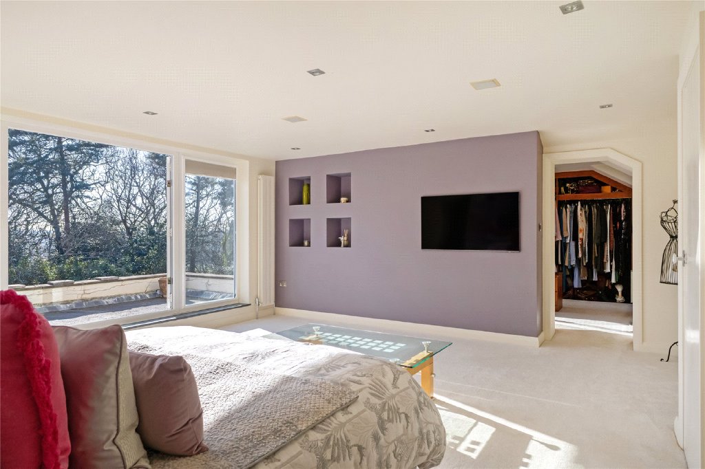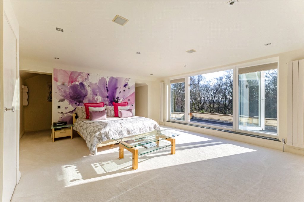 The first floor is home to an outstanding principal suite occupying a superb position within the house. This luxurious sanctuary features its own private balcony overlooking the gardens, a dedicated dressing area and a beautifully designed en suite bathroom. The en suite is particularly striking, complete with a his-and-hers waterfall shower and a large freestanding bathtub, creating a spa-like environment. A further balcony adjoins the main bedroom, enhancing the sense of space and serenity.