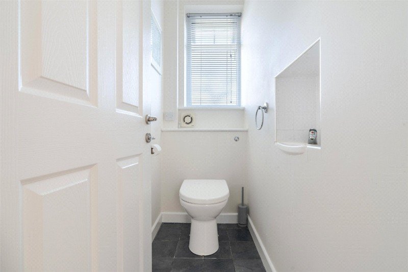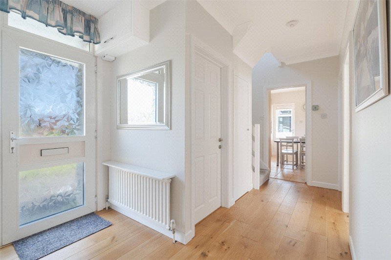 A front door leads through to reception hall featuring engineered wood flooring, understairs storage cupboard and a cloakroom.