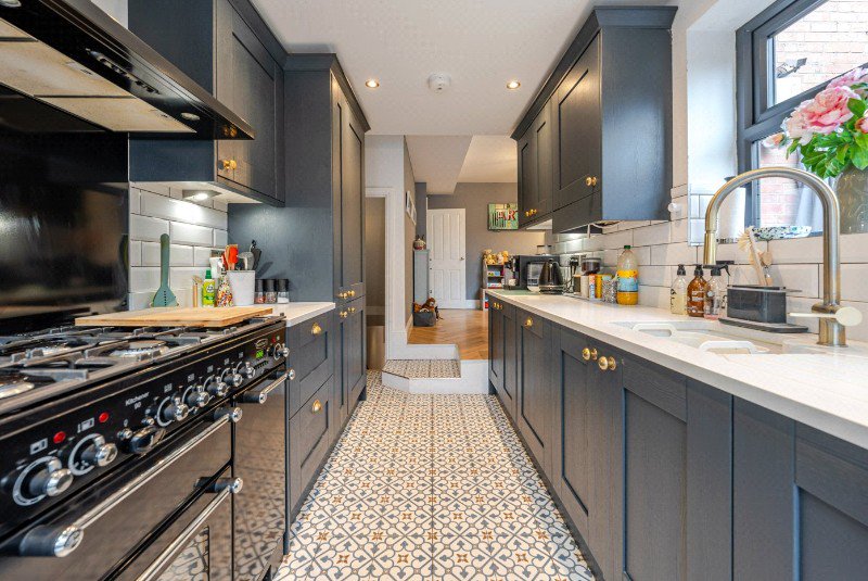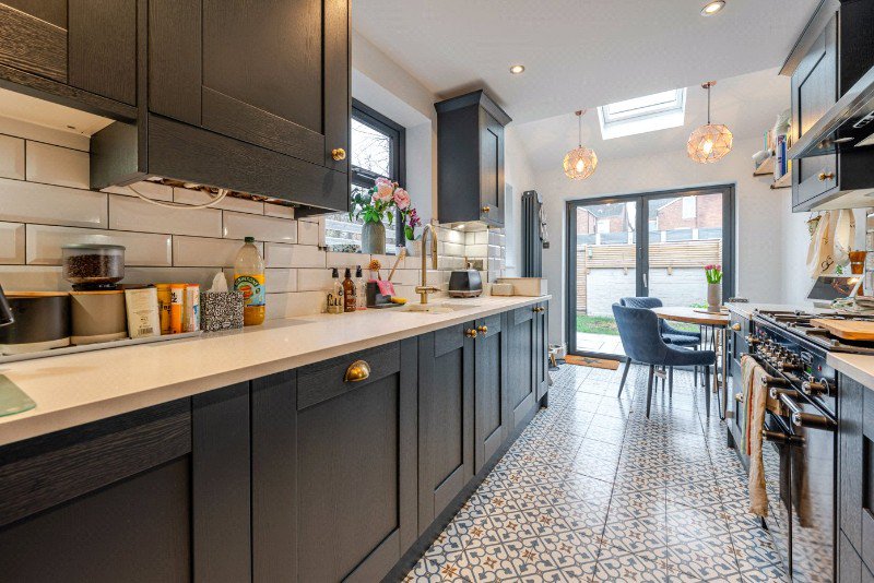 To the rear of the house is the recently installed kitchen and dining area, thoughtfully designed to form the heart of the home. The kitchen is fitted with a range of contemporary cabinetry complemented by quartz worktops and brass fittings, along with a range cooker and integrated appliances. Patterned tiled flooring adds character, while a skylight above and glazed doors to the rear garden ensure the space is wonderfully light throughout the day. The adjoining dining area provides an ideal setting for informal meals and gatherings with family and friends.
