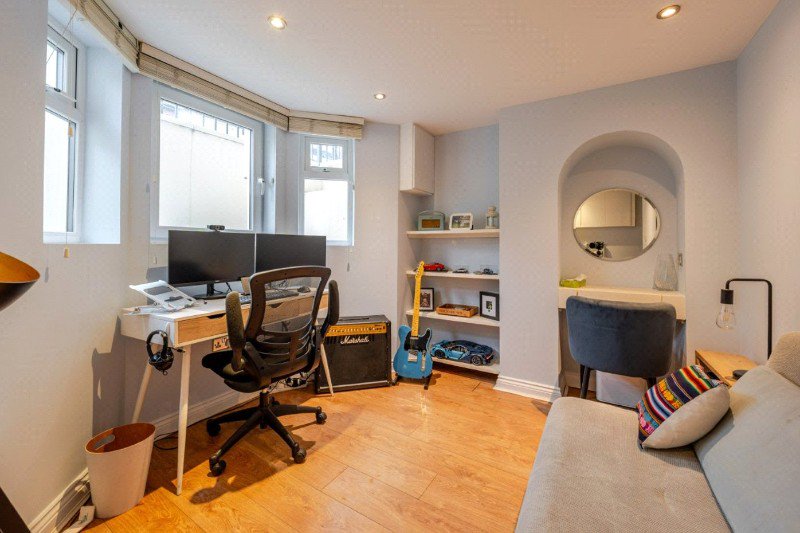Stairs descend to the converted basement, where a spacious double bedroom has been created. With a bay window to the front elevation providing natural light, this room offers excellent versatility and could equally serve as a guest suite, home office or studio space. A modern shower room, fitted with a walk-in shower, wash hand basin and WC, completes the accommodation on this level.