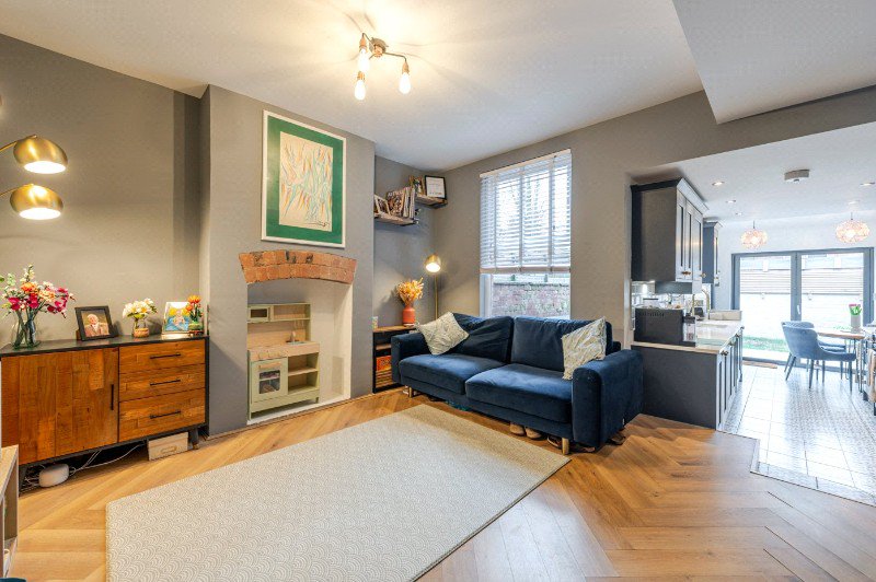 Moving through the ground floor, the property opens into a central family room, creating a cosy and versatile second reception area. A feature fireplace with exposed brick arch provides an attractive focal point, and the space flows naturally through to the kitchen beyond, making it ideal for both relaxed family living and entertaining.