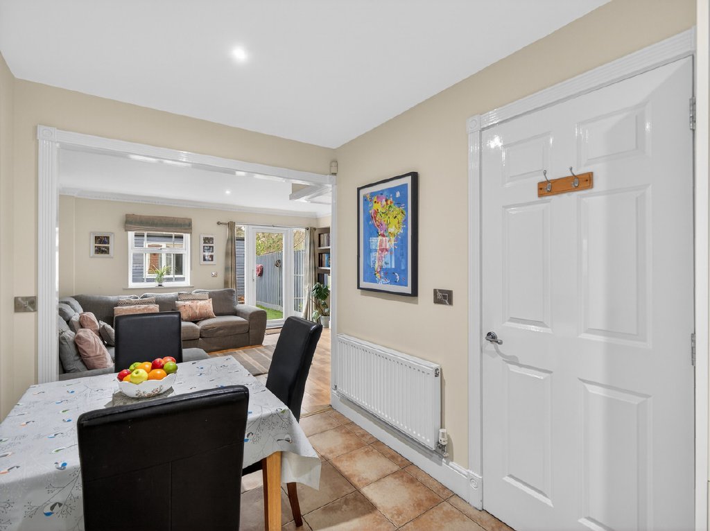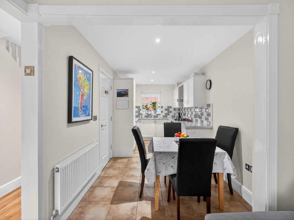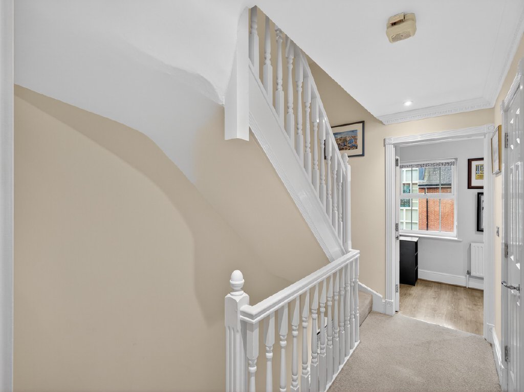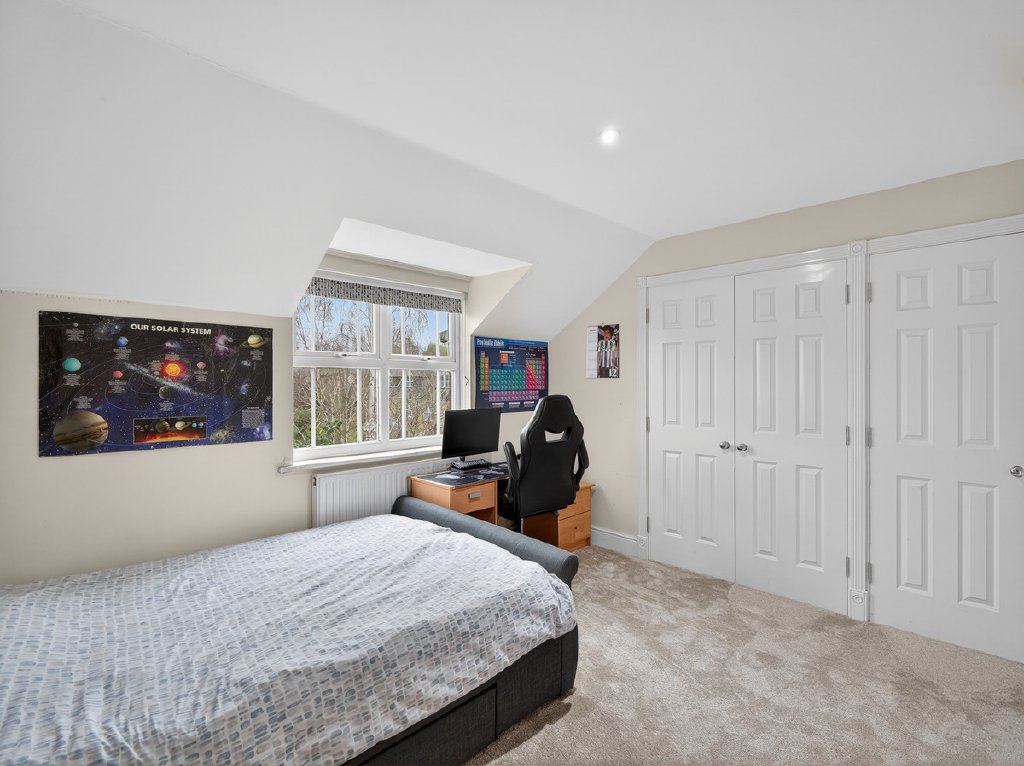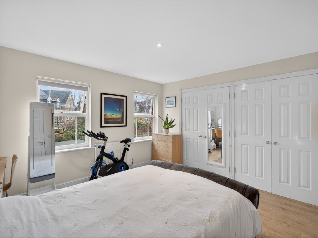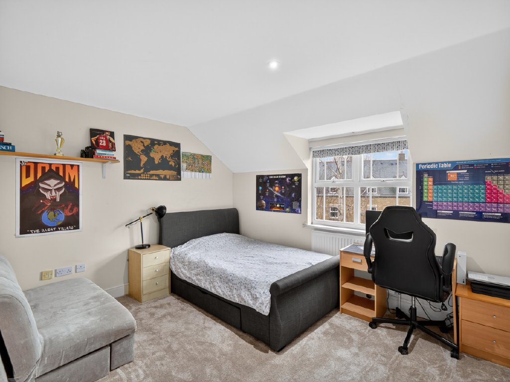 On the first floor, the principal bedroom benefits from built-in wardrobes and an en-suite bathroom featuring both a bath and a separate shower. A further bedroom on this floor is currently arranged as a study, ideal for home working. The top floor provides two additional double bedrooms together with a modern family bathroom.
