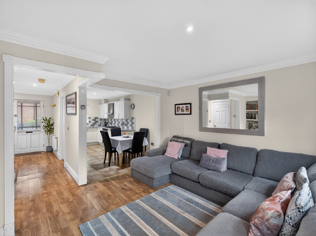 The ground floor centres around a spacious open-plan reception room with patio doors opening onto the rear garden, creating a bright and comfortable living space. Adjoining this is the kitchen and dining area, well fitted with integrated appliances and ample storage, forming a practical hub for day-to-day living. A cloakroom with WC completes the ground floor.