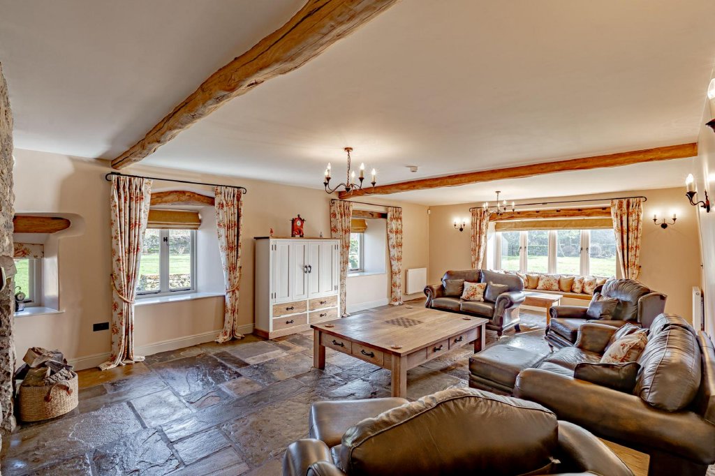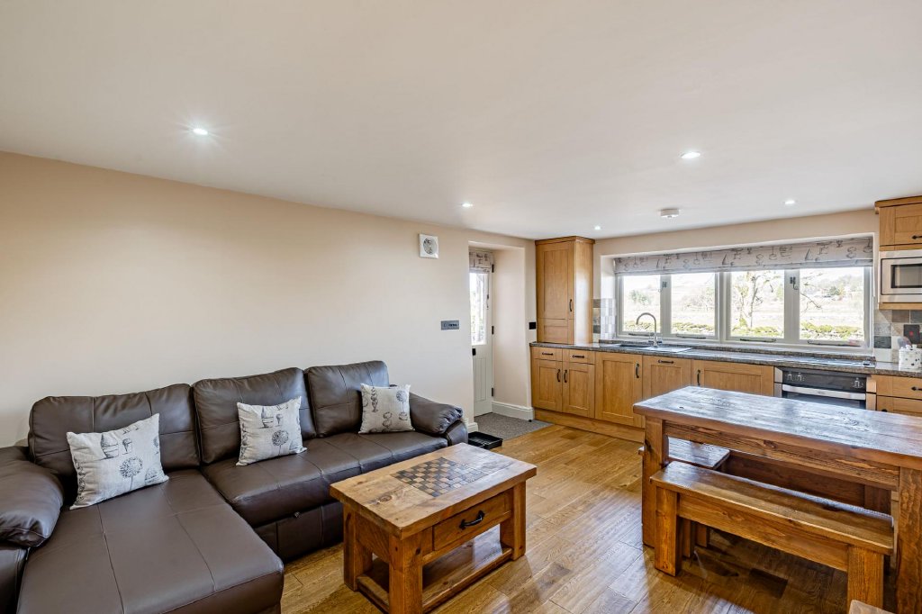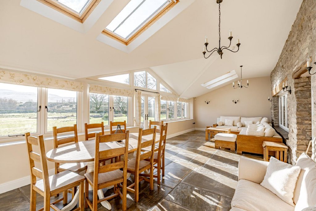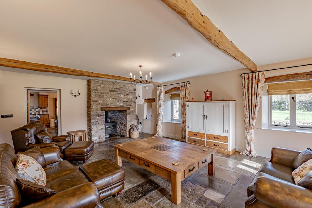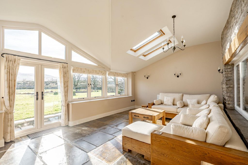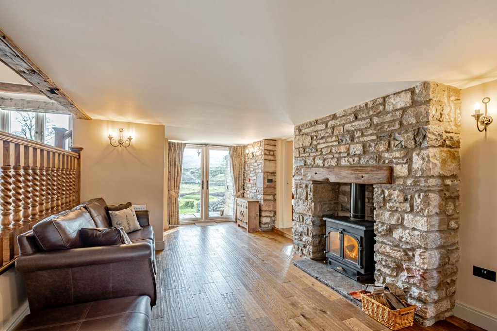 Beyond the dining area the house opens into a spacious living room where the double-sided stove continues to create a warm and inviting atmosphere. Large windows frame breathtaking views across the gardens and out towards the fells beyond, filling the room with natural light and creating a wonderful place to relax or entertain.